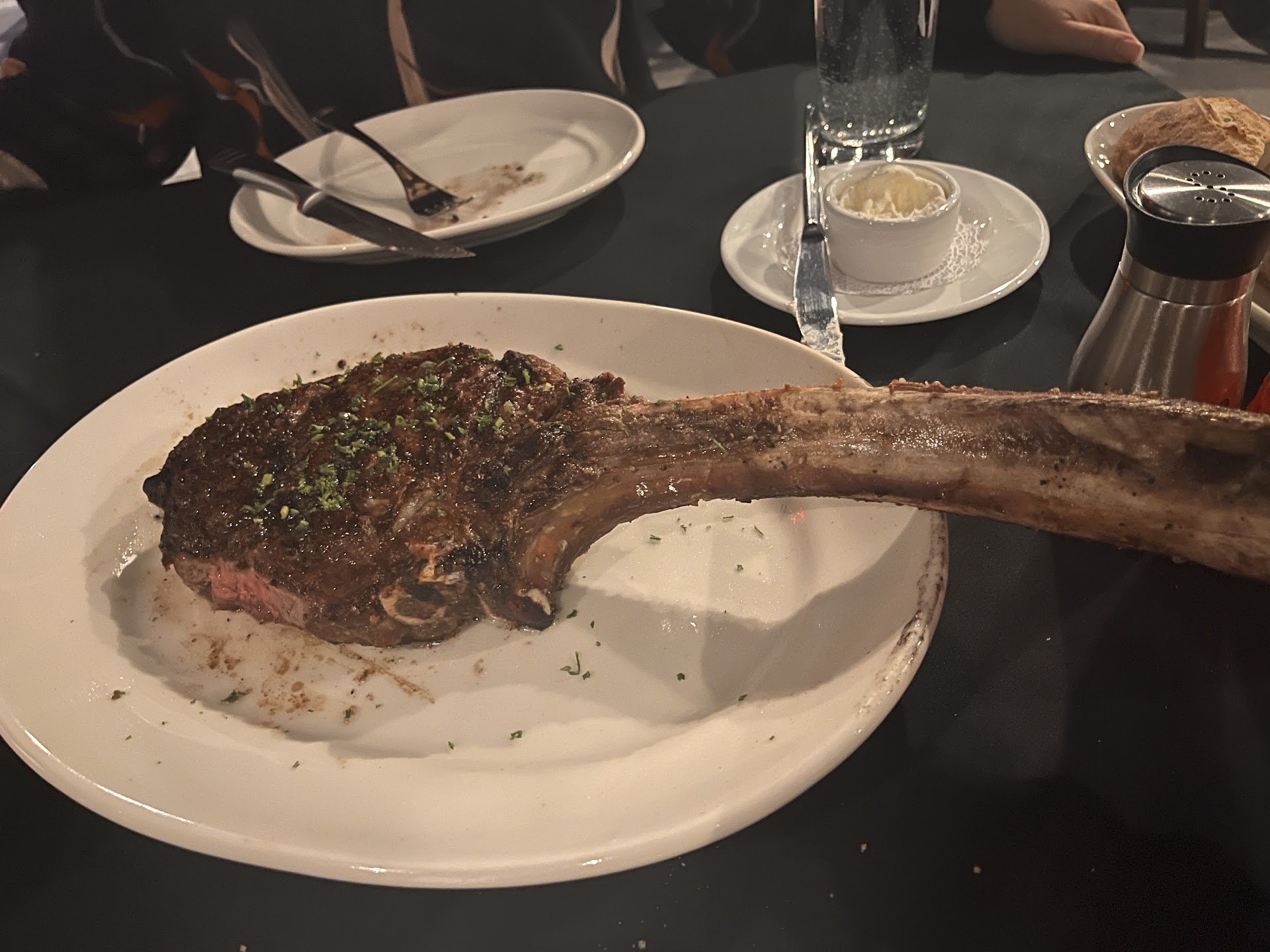 We decided to share the Tomahawk steak… medium rare. And now forget my previous comments. We both agreed it was probably one of the best if not THE best cuts of meat we have ever eaten… cooked to a perfect medium rare and the last bite just as good as the first bite. We also overheard similar comments from other tables.