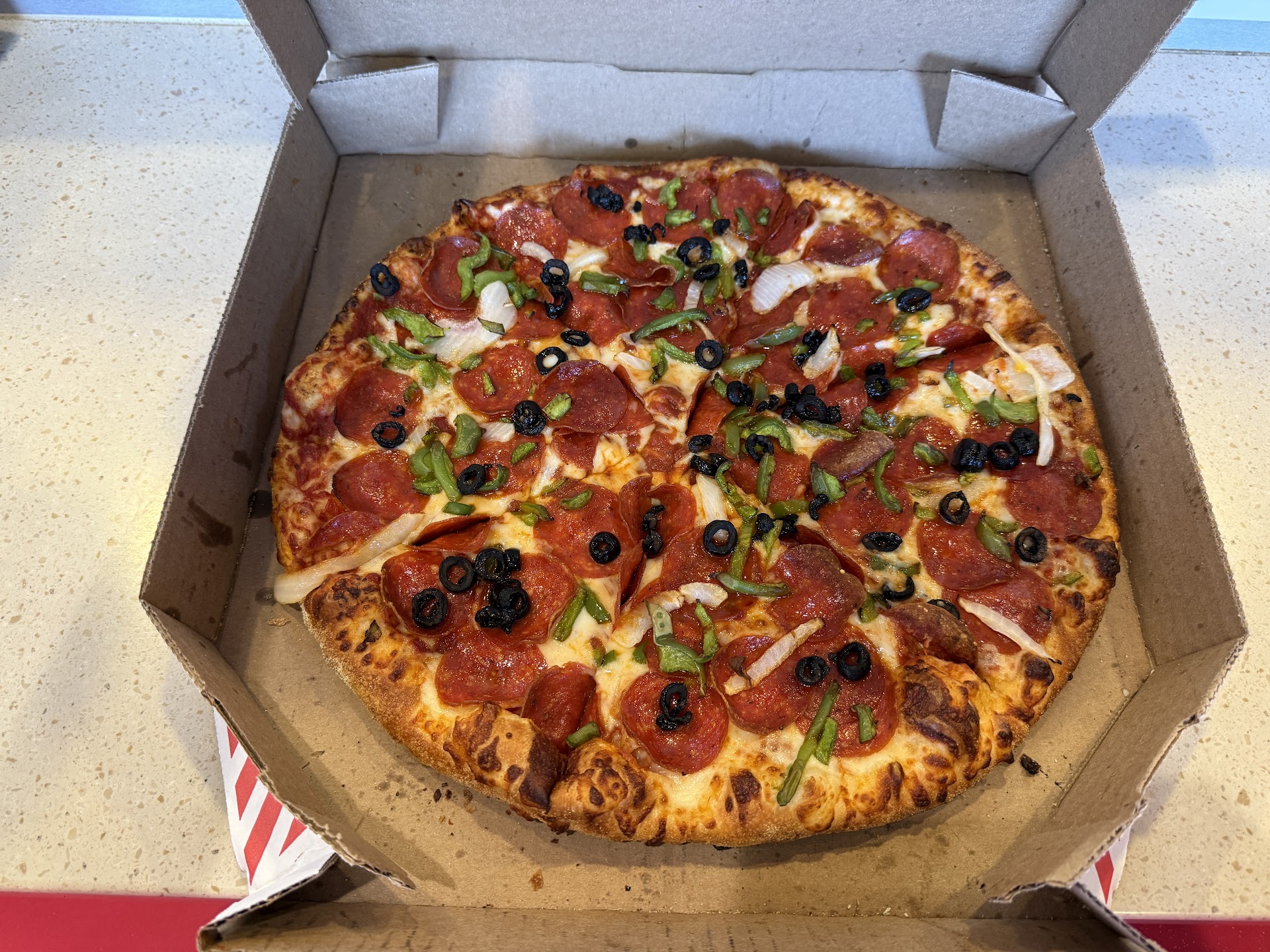 Read moreI usually don’t go to Domino’s pizza. Apparently how they determine how much toppings goes on the pizza is by weighing the pizza on a scale and then adding a certain number of toppings until it reaches a certain weight. At least that is what the Hispanic girl worker told me here at this location. Now I’ve been buying pizza all my life. I have never heard of this method of weighing a pizza to determine the amount of toppings that goes on the pizza. Now I ordered my pizza with extra green peppers which as you can see there isn’t that much green peppers. She got the extra pepperoni part right and that was it! If it wasn’t for the promo, this pizza would’ve cost me over $30. I would just go to MOD Pizza or Blaze Pizza or Pizza Hut but not the on in Archibald and Foothill because they’re also cheap asses when it comes to toppings, even after paying more money for extra toppings. I don’t think I’m gonna go back to...