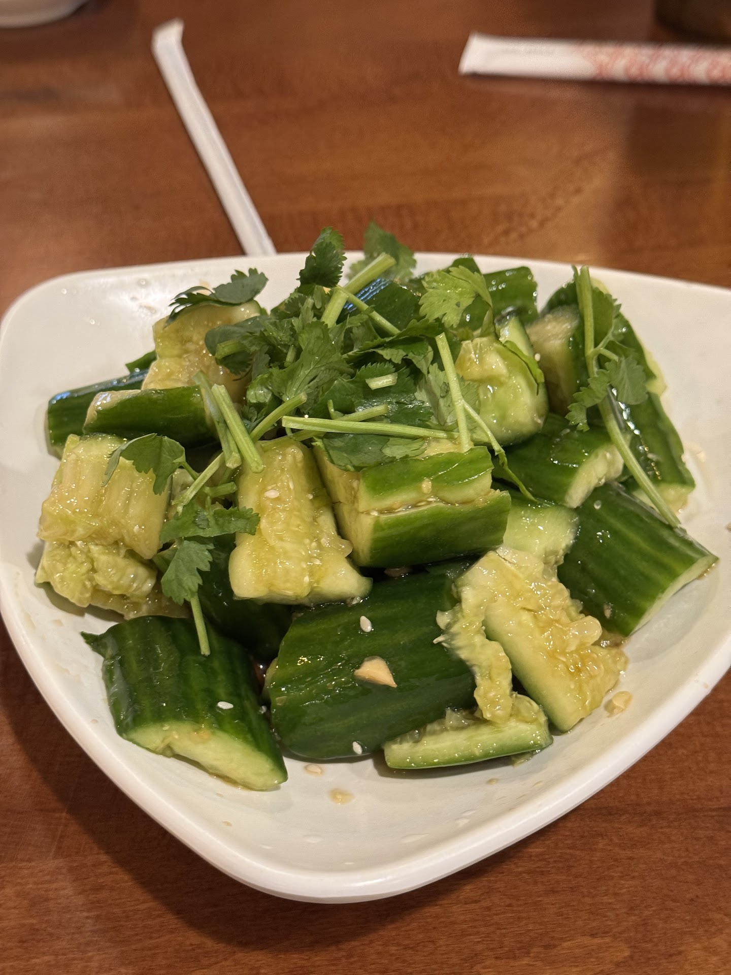 I started with the cucumber salad, which was underwhelming. It tasted like plain cucumber with a hint of sesame oil but lacked seasoning or any depth of flavor. It was bland and forgettable.