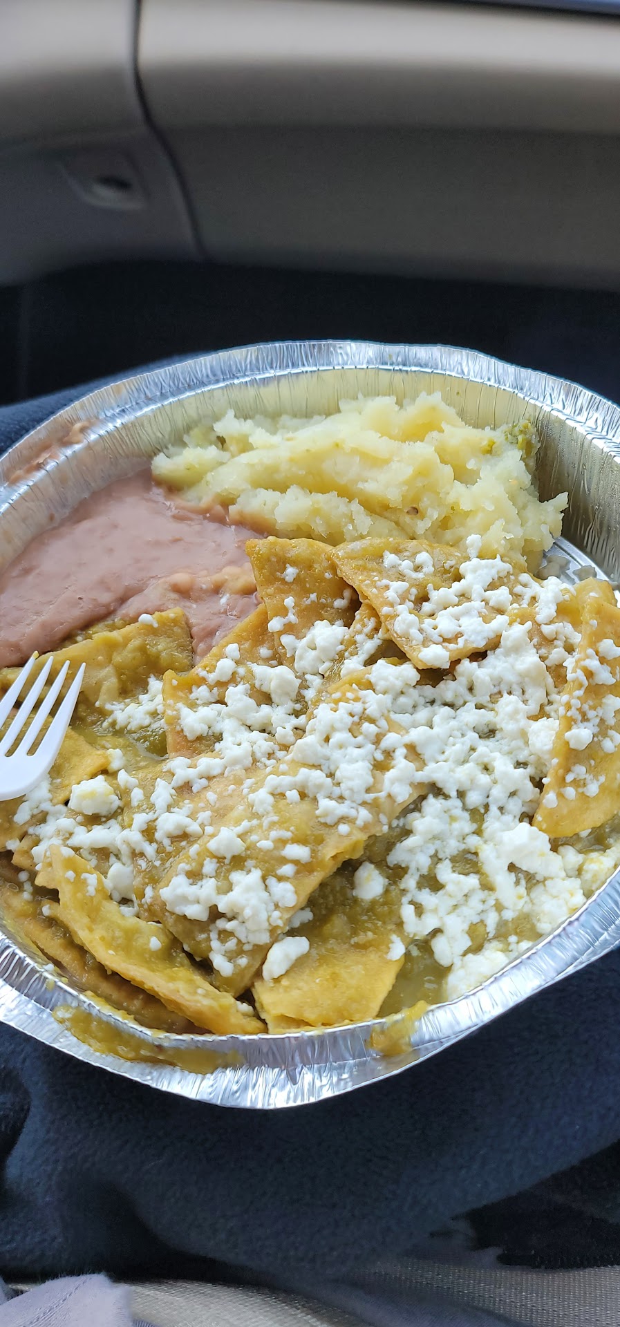 Read moreWether you have their green chilaquiles at the restaurant or to go, they are just as delicious. That green sauce is just everything and it's never tasted different from all the years I've had them here. The fried corn tortilla strips are perfectly drenched in green salsa that is tart, tangy and zesty and I love how they are so crunchy and not soggy. The chilaquiles are topped with queso fresco and I accompanied mine with beans and potatoes the perfect breakfast after a night out. ::wink, wink:: I opted out of eggs but my husband had his chilaquiles with red sauce (spicier), eggs over easy, carne asada, beans and potatoes, as well. We love the variations you can have. The papas are sautéed with onions, very finely chopped green bell peppers and seasoned with the perfect amount of salt. Their smashed beans taste like they are made from scratch and not canned. We absolutely love the chilaquiles here,...