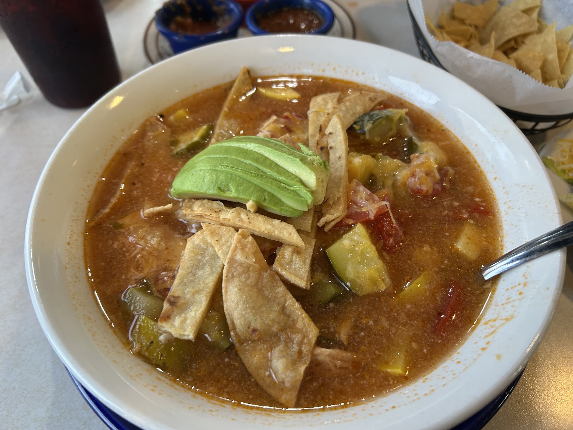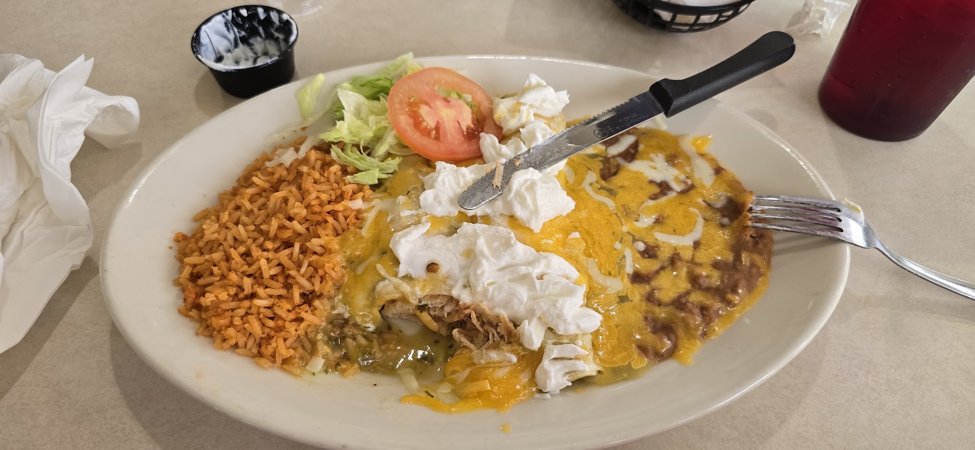 Read moreFirst time trying it. Initially, you get seated down and handed a menu, but once you order your good, you need to stand up and pay at the register. Why did I sit first ?? Then you get chips and salsa, which are decent, and salsas have some flavor but aren't spicy at all. The waitress let me know that the salsa for the enchiladas I ordered wouldn't be spicy at all either, but I went ahead and still got the enchiladas verdes with rice and beans. For my drink, I got Jamica, and she let me know it was from the machine, which sucks but I still got it. Once my food and drink came out, I had one regret and disappointment after the other. Water lacked flavor tasted like one of those waters with fruits and pears in them like just plain water with a hint of Jamaica. The enchiladas barely had any sauce on top plus a mix of american yellow and white cheese that at least was melted and poured onto the beans. Tortillas were hard and undercooked. Chicken was not grilled but was shredded with possibly seasoning for what would be a different plate such as Tinga. The sour cream was given on the side, and I had to smear it onto my enchiladas.. on the side was a bit of lettuce and one slice of tomato. The worst and what made this plate disgusting and hard to continue eating was the beans they were so DRY and tasted like they were canned. The only good thing this plate had was the rice. It was well cooked and had good flavor, but everything else sucked and tasted horrible. I understand it in a business complex and probably caters to white customers, but man, it was so bad was not spicy and bland, but only the rice was good. I just almost finished it because I was starving and wanted mexican, but had I not been so hungry, I'd ask for a refund after the first bite. Total was $18.21 and for the quality it's overpriced. Place was real emty too when I came in. Should've taken that as a sign but...