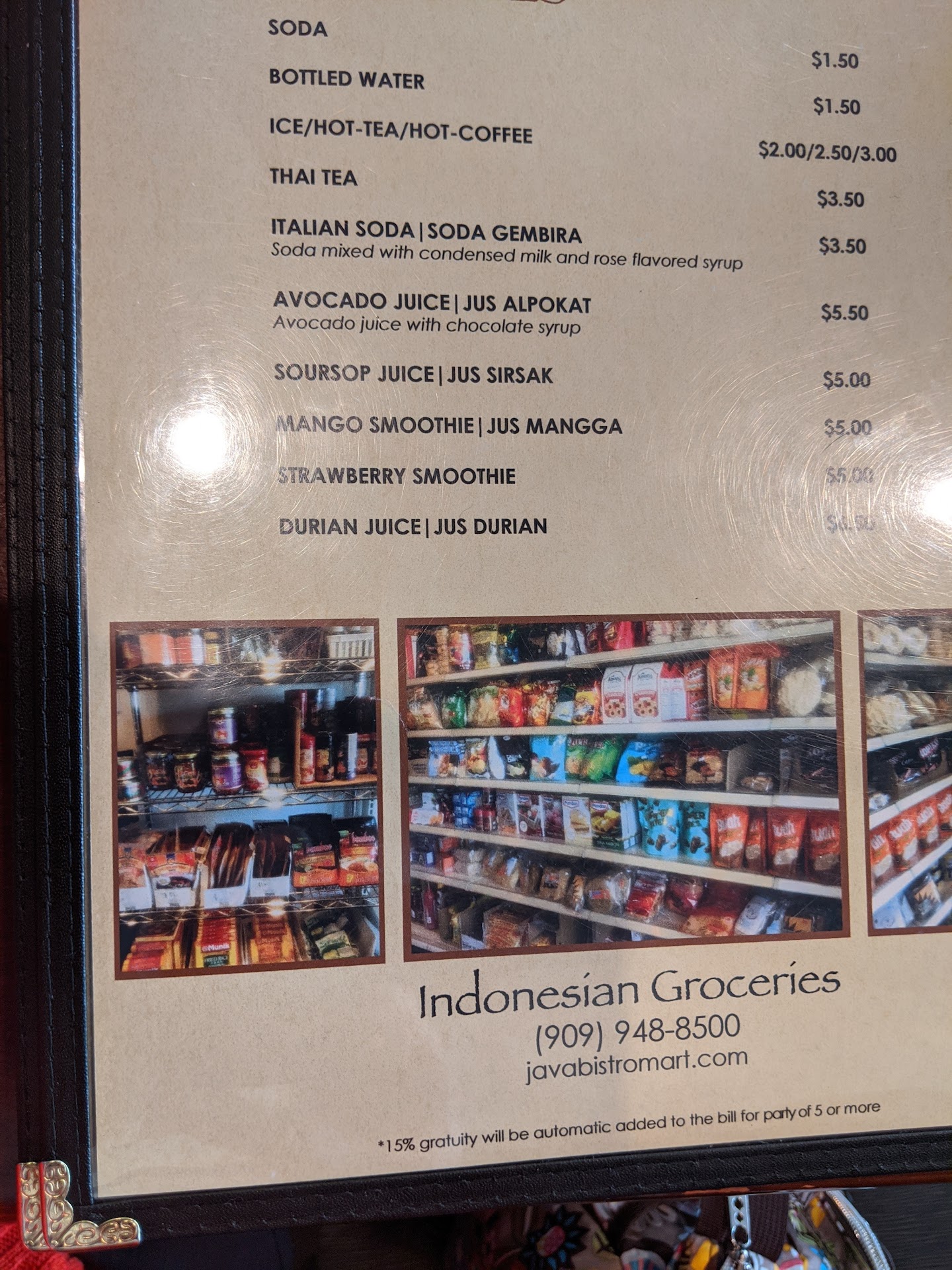 Read moreLocated just off Miliken Ave in Rancho Cucamonga, CA, is this LOVELY GEM of an Indonesian restaraunt, Java Bistro. The food, service and atmosphere here is absolutely amazing. The restaraunt is small, yet bustling with the sould of kitchen noises and the Indonesian language being spoken (Bahasa?) with a slight touch of music in the background. Now, to be completely honest, this is NOT my first time eating here by any means. Due to my travels, I come around the area frequently and try to eat here whenever possible. My favorite dish(es) are: Nasi Campur (Nahs-ee Cham-poor), which is a bunch of delicious types of pork (pork belly, sausage, etc) served on a bed of rice with clear soup, slices of cucumber, a liquidy sweet/savory sauce and Sambal (Saahm-ball); Satay Kambing (Sah-tay Kam-bing) which is bits of Lamb on a bamboo kebab skewer (served with a sweet/spicy sauce, and on a bed of rice if you choose); And Tahu Isi (Ta-who Eee-see) which is basically an egg roll, except it is Tofu stuffed with the same filling, battered and deliciously fried. I also buy some of the things on the table at the front, such as various cakes, stuffed rice things, and so on.