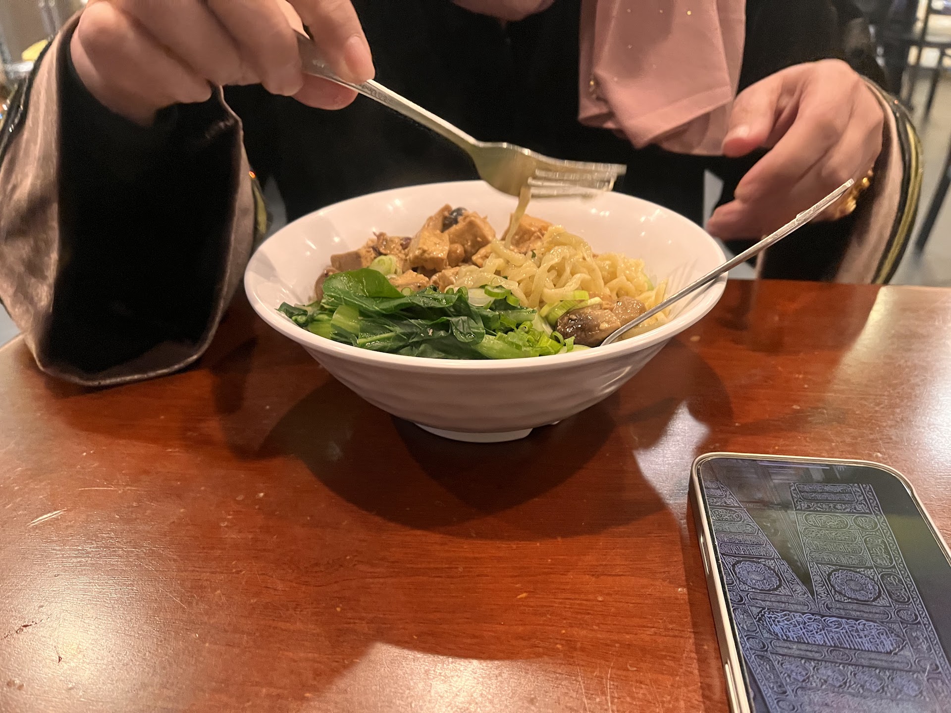 The Nasi Padang was a rice plate with fried chicken, fried tofu, beef, and topped with colorful crackers. The rice was not initially served with Sambal, but upon request, the waitress provided it. The crackers reminded me of my time spent in Indonesia, particularly Bali and Jakarta. The fried chicken portion was small, resembling a spring chicken; I reckon I received about a fourth of the entire chicken, smaller than my fist. However, it was flavorful. While the beef seemed slightly overcooked, it was palatable. The Sambal sauce was exceptional; I even took the remainder home and made an entire meal with it.