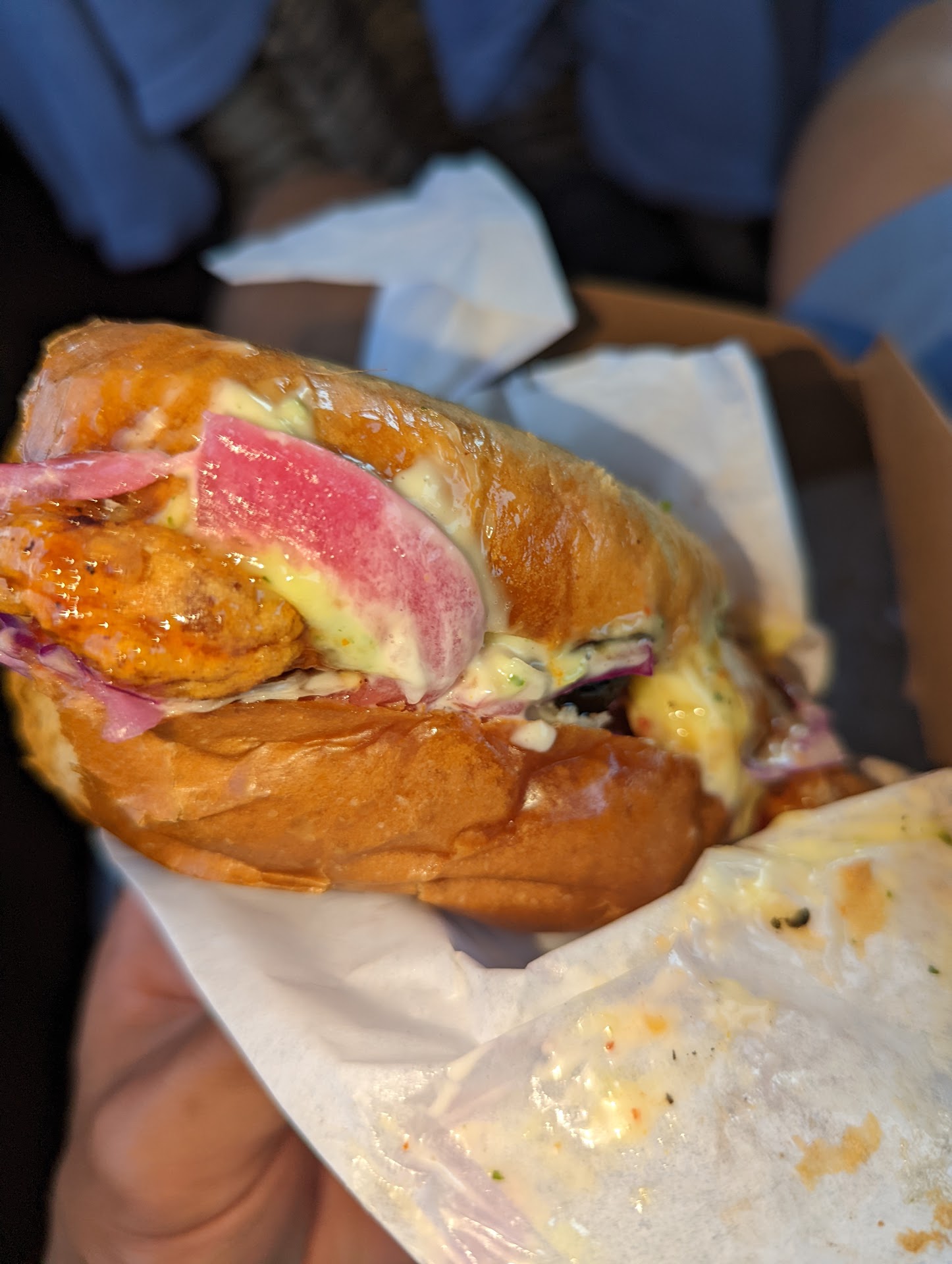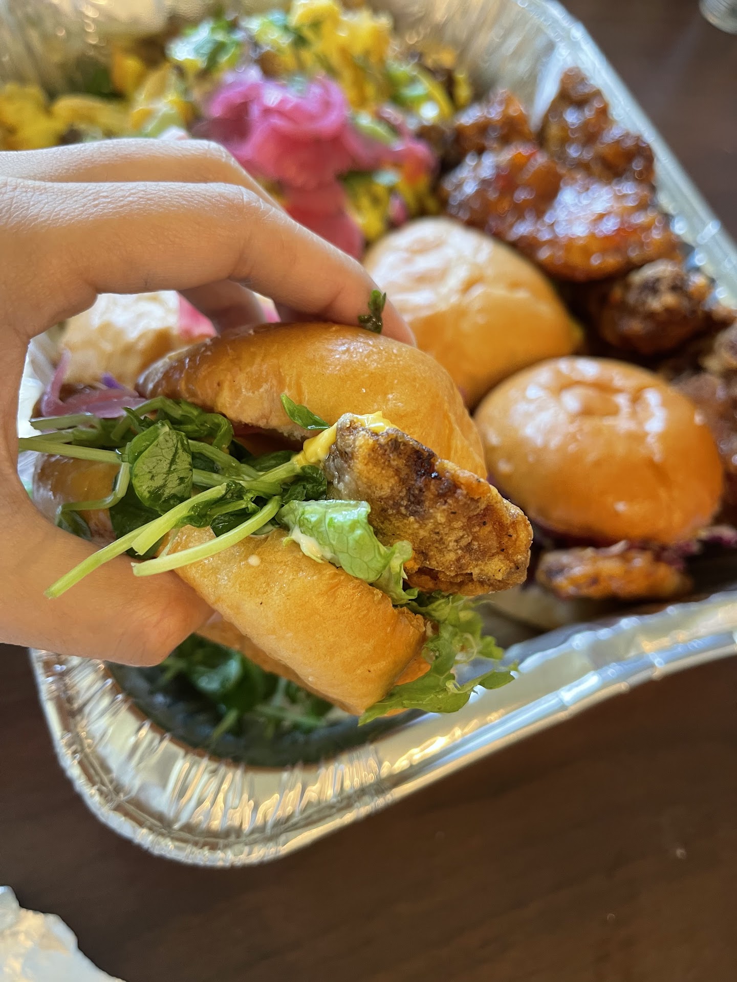 The Duo Sliders were such a thrilling surprise to this journey, as if a pair of twins from Korea with different personalities (Korean Hot and Seoul Chick) each showed me around their home town to give me a different experience despite being in the same area of modern Korea. Now lets go lets go over each personality. The Seoul Chick was a more savory flavor with a hint of sweetness, it took me around Seoul and showed me all the quiet coffee shops and bakeries that offer small bites of memories that take you back to when you rode a bike alone for the first time around the neighborhood. The Korean Hot however, took me to all the crowded night clubs and bars that are well known amongst the young folk, these places are known to be THE spot for parties, the spot where you want to have a good time with friends at night but wake up in the morning in someone's laundry room with 20 minutes left on the dryer. The spice gives you a gentle pinch on your booty but not enough to repel the easily spiced. The chicken was very crispy and coated with said sauce but the inside is warm, tender and juicy as opposed to its breaded exterior. The buns are not like any other burger buns from your local Walmart, these brioche buns are buttered to perfection as if they were designed to lay softly on that chicken breast to provide a comforting soft layer for your tongue.