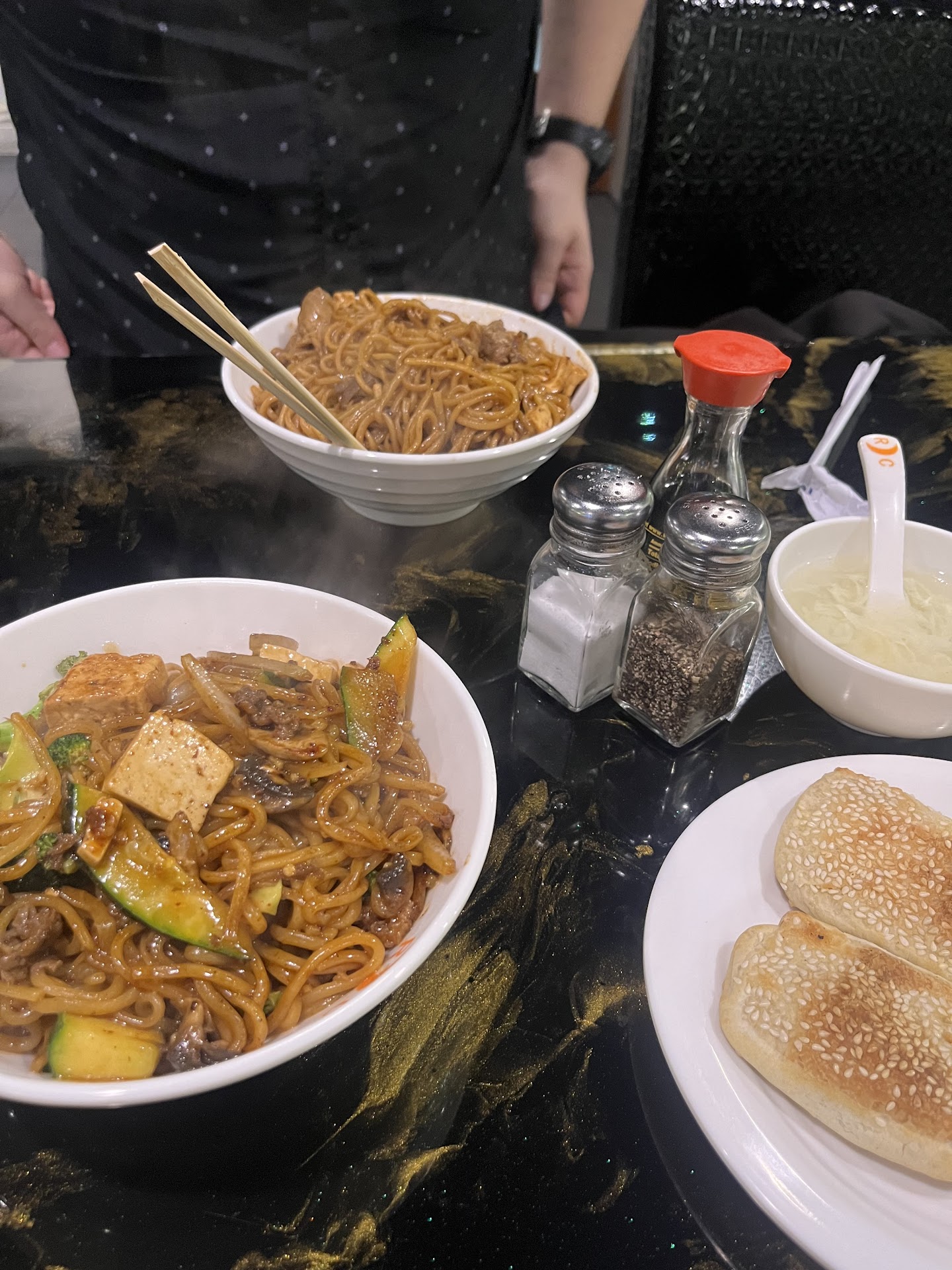 I asked the waitress if she wanted to give us boxes to go then we wouldn't mind just taking our food to go so they could clean and go home. She said “NO to go boxes with all you can eat!” I told her I understand that but you guys are closing and you didn't tell me that the grill would be turned off at 8pm. She said just this one time! We took our boxes and started to walk towards the door when the grilling guy started yelling towards us saying NO to go boxes, the lady came to try and calm him down, he started swearing at us and I told him I am just trying to do you a favor so you can go home. We proceeded out the door when my wife told me that he was coming after us running towards the door. I turned around and he was in my face, he grabbed my to go box and ran back into the restaurant. I went back in and he was yelling and screaming, meanwhile the hostess was arguing with him as well. He told me, you are lucky we even gave you a to go box, we usually charge by the pound. I told him just keep your food, I don't need it. My wife did end up with her to go box. In the end we paid $55 for one bowl of noodles.