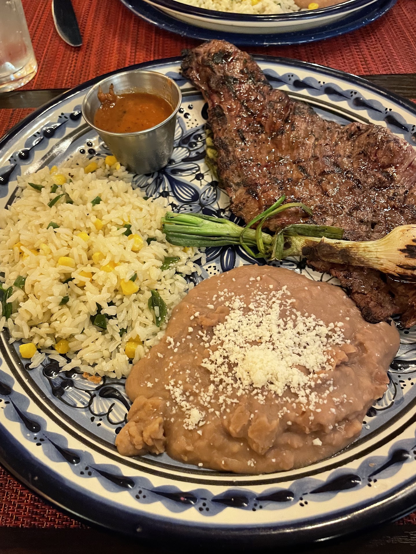 Like some of the other reviews mentioned, they don't start you with chips and salsa, but we did get a couple mini appetizers on the house. This amuses me. I don't know what it is.....but while we were there my husband was ALSO questioning why there was no chips & salsa (That is his favorite part of coming to a Mexican restaurant LOL) . The table we sat at was set for a party of 4, and they did not take away the extra plate settings. After our server dropped off our appetizers, she didn't give us any napkins and my husband had to get up to ask her for some. We were the only table in the restaurant by the way.