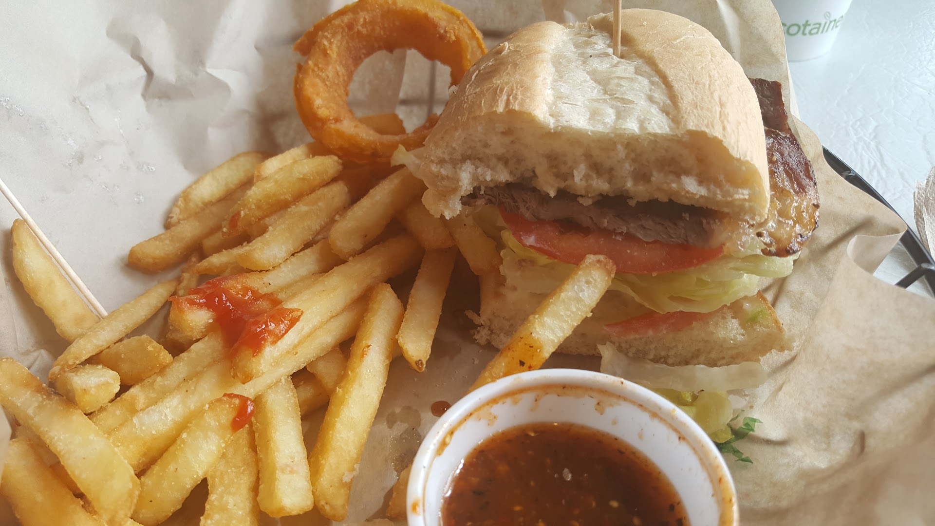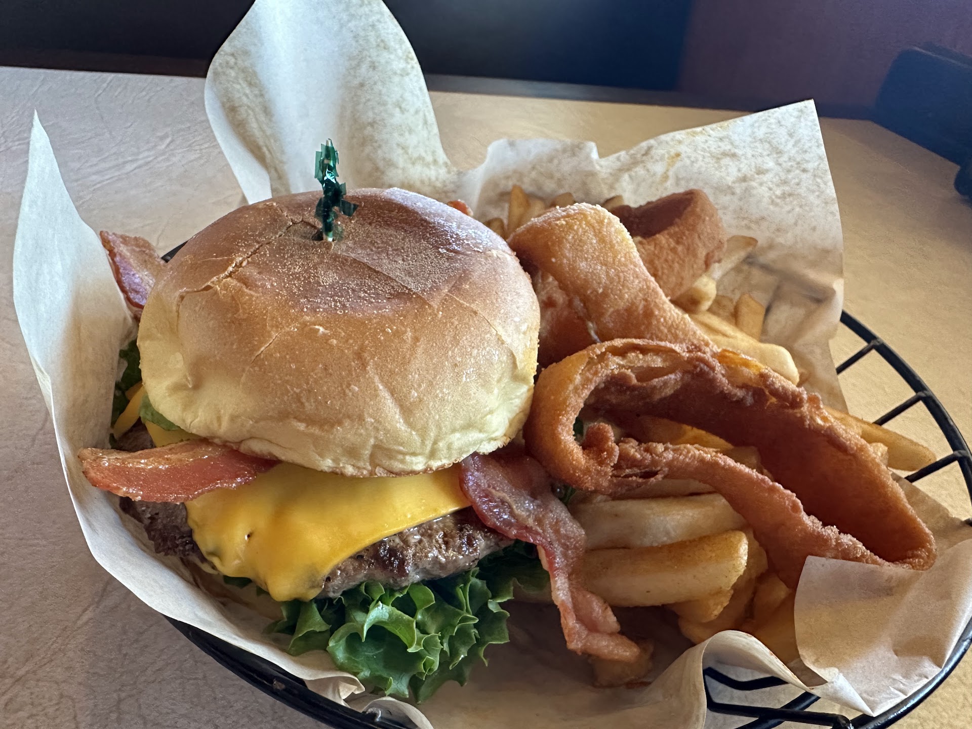 Inside of a fast food burger joint with a menu and decorations of a sit down restaurant (like chili's). Kind of confusing. Their hamburger patties are 1/4 pound so I had a double, no cheese, tomatos or pickles but extra lettuce. I was able to get a mix of half fries and half onion rings. I can't say what their specialty is because they had so much to choose from: breakfast items like ham & eggs, omelets and more. Hamburgers and sandwiches. Steak, shrimp and chicken. The place was clean, they got my order right and it looked good. The fries were an outstanding consistency. Crunchy and some soft in the inside. I love fries like this, but I really didn't like the taste of the fries. The onion rings were great, so hard to find good onion rings! Only problem was that they were a little greasy so I don't think I would be able to eat a whole serving. The hamburger was fine. Meat tasted like meat, onions were not over powering, lettuce gave a nice crunch. Thousand Islands dressing was good. The poor part was the buns. They reminded me of store bought. The bottom bun was mushy on my fingers and the buns stuck to my teeth as I ate it. Would I come here again? Maybe, if I have friends that wanted to go. Should you come here? Yes, why not? My taste may not be the same as yours. If you never been, then give it a try. This was my first visit and I...