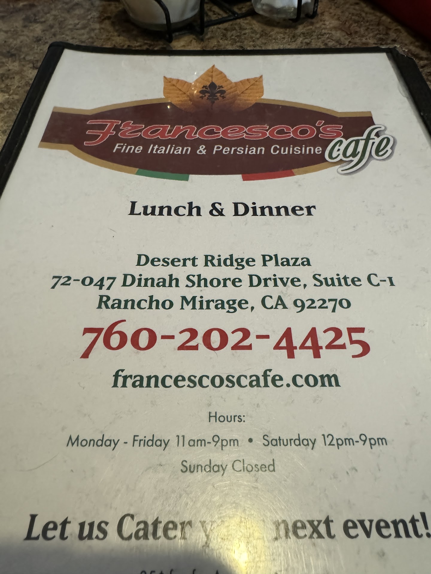 Read moreFrancesco’s has excellent food. The attitude of the staff and owners leaves so much to be desired. They act as if they are doing customers a great service to allow them to enter their restaurant or to order food to go. They appear to be totally understaffed. If takeout orders bog down their service, then perhaps they shouldn’t offer takeout. There are few places in the desert with better pizza and their menu of Persian/ Italian is unique and tasty. Tonight was our final effort to try to have a good dining experience at this place that we used to frequent regularly and have enjoyed in the past. During recent visits, the lack of attention and service has become more pronounced...