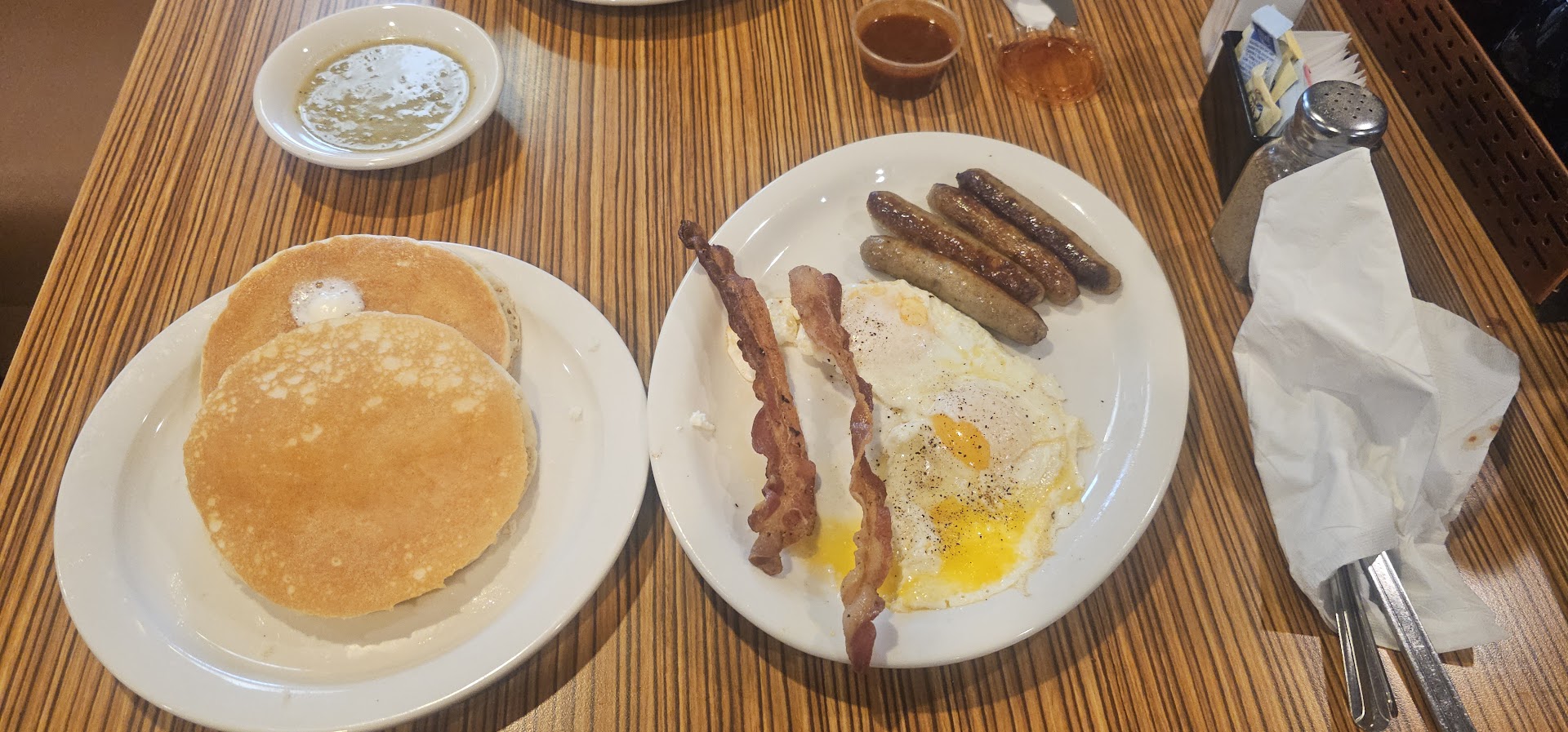 Read moreWe went in, tried something new. Definitely won't be back. Thr place was empty. Server was just too busy (bored) to pay attention. Got my kid's order wrong. It happens. My food came out on a warm plate but eggs and back were ice cold. French toast wasn't warm enough to melt the butter. Husband had a combo. His eggs were at least warm. Pancakes were terrible. He had two bites and just said they were bad. I tried a bite. I knew immediately it was a generic dry pancake mix. It just had that flavor. They were very much over cooked too. The replacement food for my kid at least came out hot. Never saw server again. Had to stop someone and ask for a drink refill. Went to go pay before we got the check. By the time we left there were two other tables seated. It wasn't too crowded for basics. All this for $56.14!! It was a lot more than I expected. I hoped it was wrong but did the math, it was correct. $3.75 for a kid cup of...