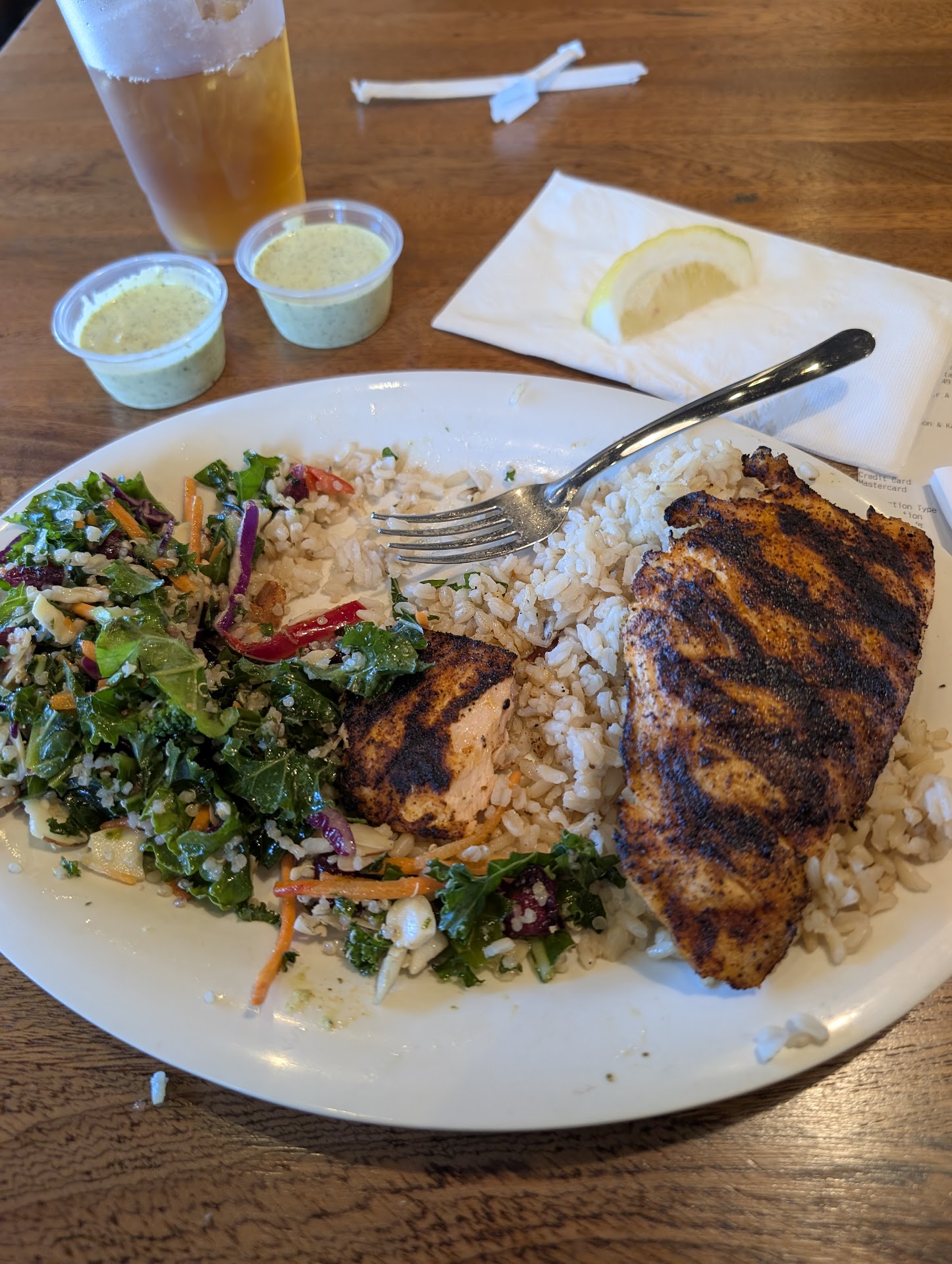 A Delightful Lunch at Spikes: Fresh Flavors and Relaxing Ambiance After a morning of shopping at Lowe's, I popped into Spikes for lunch, and it was the perfect respite. I opted for the blackened salmon with a kale salad and brown rice, accompanied by a refreshing regular iced tea. The blackened salmon was cooked exactly to my liking ā perfectly flaky and flavorful. What truly elevated the dish was the pesto sauce, which offered a delightful savory dip for the fish. The kale salad was a vibrant mix of fresh ingredients, bursting with the sweetness of cranberries, the crispness of red peppers, delicate carrot shavings, the nutty chew of quinoa, and a good crunch from the cabbage. Even the brown rice was notably fresh and well-prepared. Beyond the excellent food, Spikes offers a wonderfully clean and comfortable seating area with a truly peaceful ambiance. It was the ideal spot to relax and recharge. Sandwich style salmon with kale salad is the other entree offered here. Fresh thin bun surprisingly tastes excellent too. I'll definitely be back to Spikes! It's a fantastic option for a fresh, satisfying meal in a...