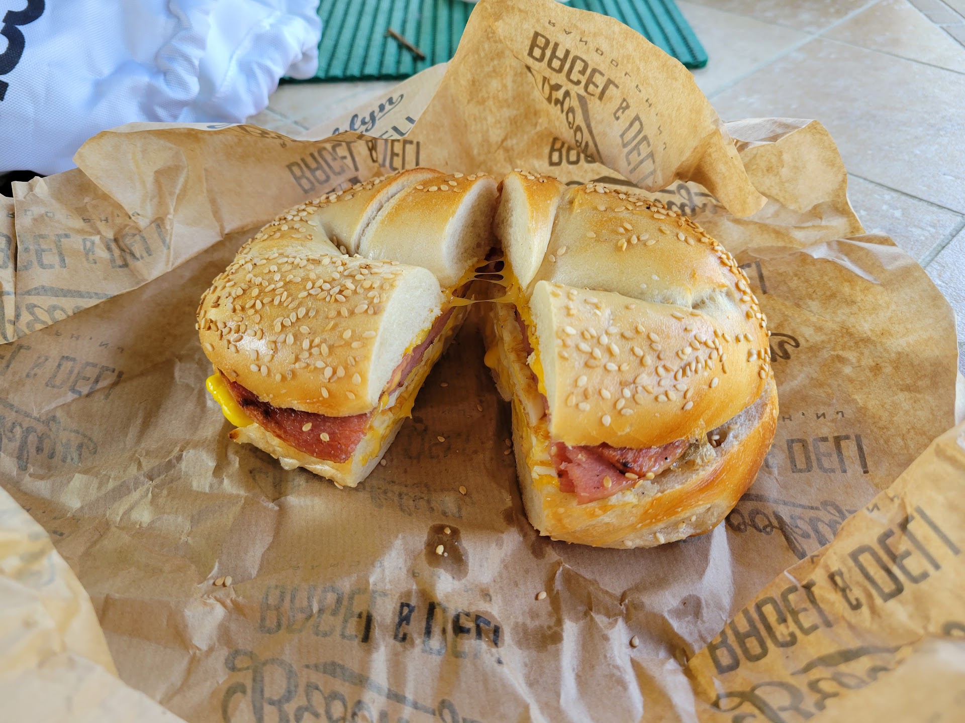 Read moreTaylor Ham, Egg and Cheese on an Egg Bagel with Pepper and Ketchup. The egg bagel was huge, Taylor ham was thick and it wasn’t too salty. Great sangwich.