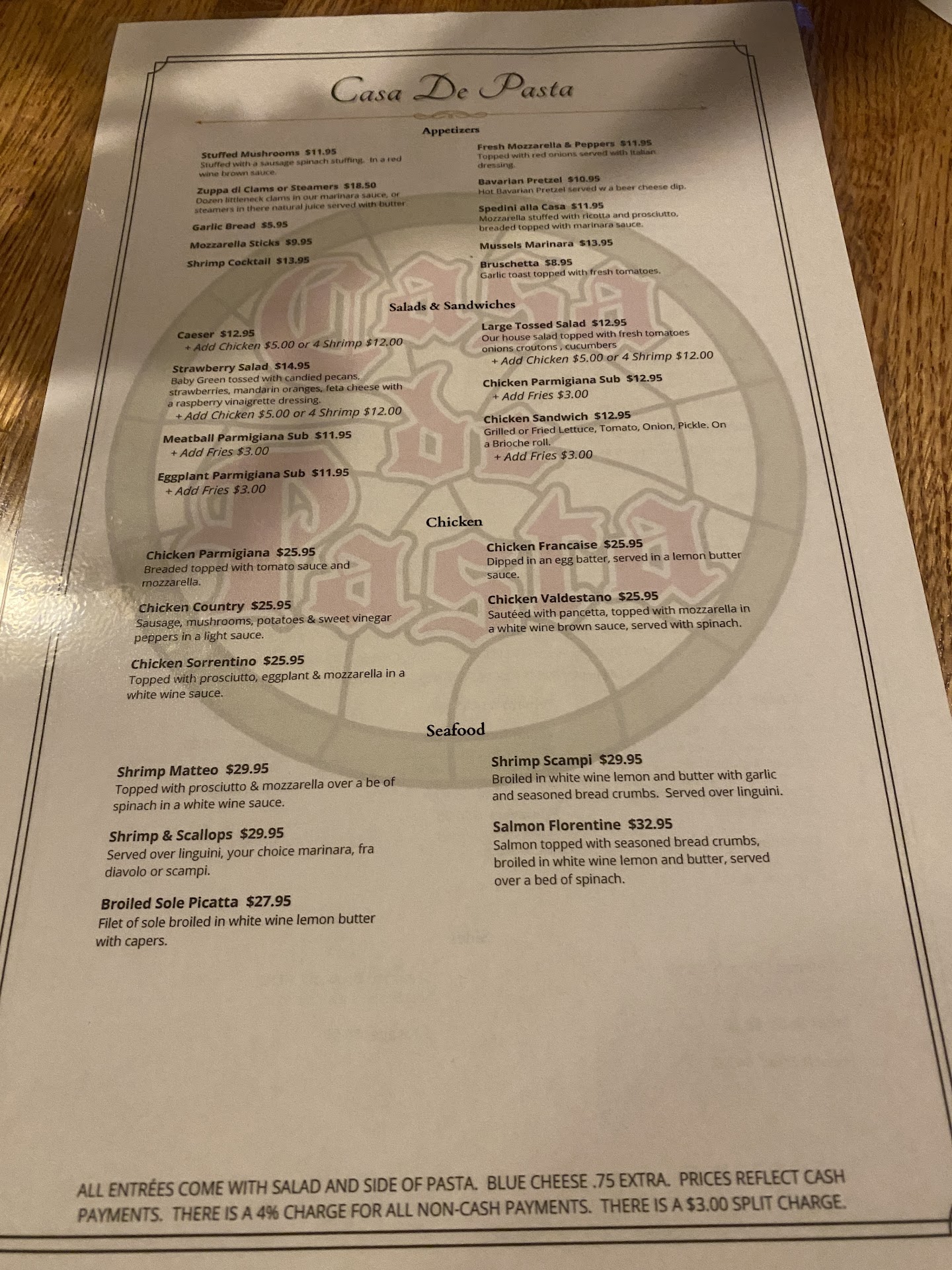 Read moreIt was a chilly January night, my dame and I were trying to decide what to do for dinner, after a little altavista’ing we found this place. Put some shoes on and we headed to the casa. Upon entering we were able to see all the waitresses as each one walked by so focused on their job they didn’t even realize we were waiting to be seated. When we were seated our waitress came and we ordered drinks and put in an order of mozzarella sticks, it’s not just about pasta at the casa! The waitress poured my cuh her martini in front of her and made sure she ordered her house salad before using the restroom. The food came and between the butter packets and my cheese tortellini with my sauce “tomato”, boy were we stuffed! We settled up our bill and promised each other we would return soon… bring a quarter too they have a...