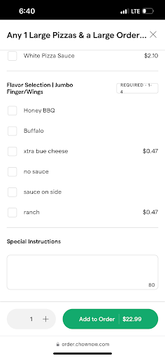 Read moreFirst time trying this place. Center Street Famous use to be my go to but after too many mess ups we decided to try a different place. The food was not great. I was really looking forward to tasting some delicious pizza based on all the positive reviews but was disappointed to bite into a slice that tasted very bitter and quite flavorless otherwise. I had to dump pepper, crushed red pepper, oregano, Italian seasoning and onion powder and hot sauce on the pizza to mask the bitter taste and actually get some flavor out of it. The pizza was actually so bad nobody else wanted anymore. We ended up tossing the rest in the garbage and that NEVER happens in my house. The fries were also bland. The wing dings were fine, but then you can't really mess that up since they already come premade and the store just deep fries them...also got a steak tip Caesar salad. The steak was well seasoned and well done like I asked but tough to chew. We also ordered chocolate chip cookies and a brownie. The cookies were so thick and hard, cookies from pizza shops should be soft. The brownie was pretty good. Probably the only good tasting thing we got from here. All in all this place is not great and I really don't understand all the good reviews. We will have to keep trying other spots elsewhere I guess. Will not be ordering from this place again, that's for...