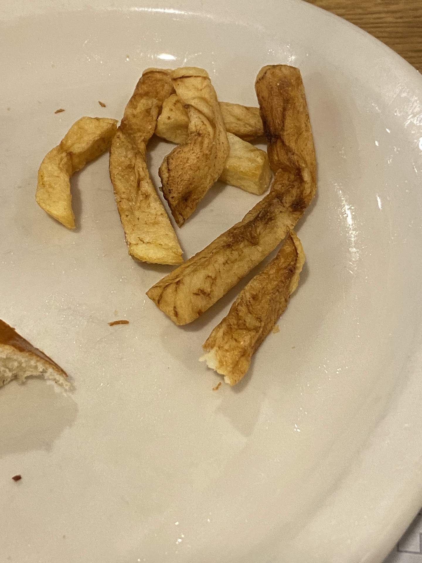I also had the Spicy Steak Fries as a side, and these, while appearing nicely crisp on the outside, were also not seasoned, let along "spicy". They were also cut as approximately 1/4 of a potato, and so were overly thick, and so were underdone in the middle. Barely past raw, and also inedible.