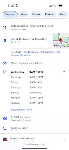 Read moreWe were part of a group of about 20 people who went last Saturday for a get together. The upper bar was great and both servers were excellent. Website said live music every weekend which is why the place was chosen. At 9 they opened the lower bar, which was fine as we wanted more room. Shortly after they closed the upper bar. Again, not a big deal. Same servers came downstairs, and did great. There was no music. Ok, um well, I guess we will drink and mingle. 10:45 they call last call… Really? You had 25 people in the bar and more coming in. The signs on the door say 1am. The website says 1am. We get booted at 11 and while we were standing outside trying to figure out where to go next at least 5 more people walked up and were disappointed when told they closed. Rapid City businesses really need to learn to stick to their schedules. Not sure we...