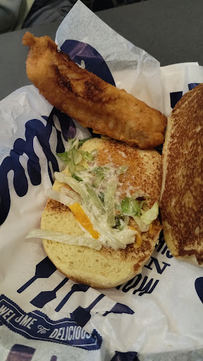 Restrooms are modern and clean, not large enough for a huge rush though. My kids did not enjoy the chicken strips, not sure why, they appeared decent but they simply didn't like them. I had the Cod sandwich to change it up from a burger, it was sadly not impressive. Held on to too much oil, and half way through got that typical "I ate to much fried food" feeling. Fries are decent, and crinkle cut. I think they would do much better if they would shrink the menu to half of what they serve, and stop trying to be a restaurant, and just be an exceptional fast food joint for...