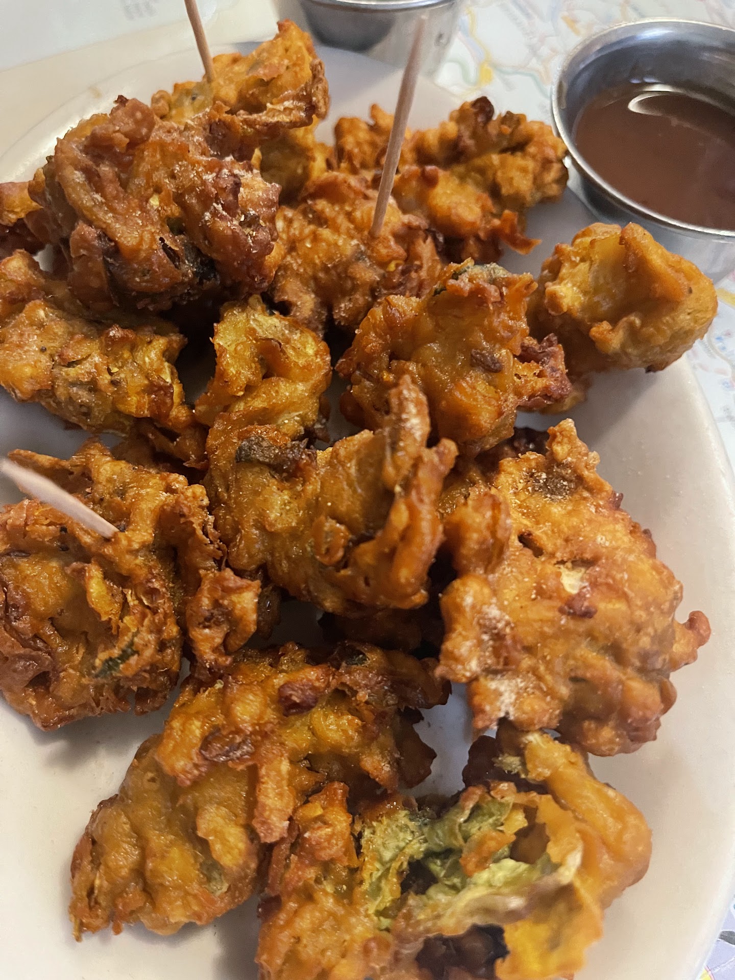 Any Samosa. Samosa Chat is delish too, its served cold, but it is refreshing, and FULL of flavor. Lots of yogurt, mint sauce (it works wonderfully), and tamarind. Oh, and this AMAZING dust of their "signature" seasoning. Im not sure what it is for sure, but they dust it on their lamb samosa, as well as their chicken pakoda. I wish I had the...