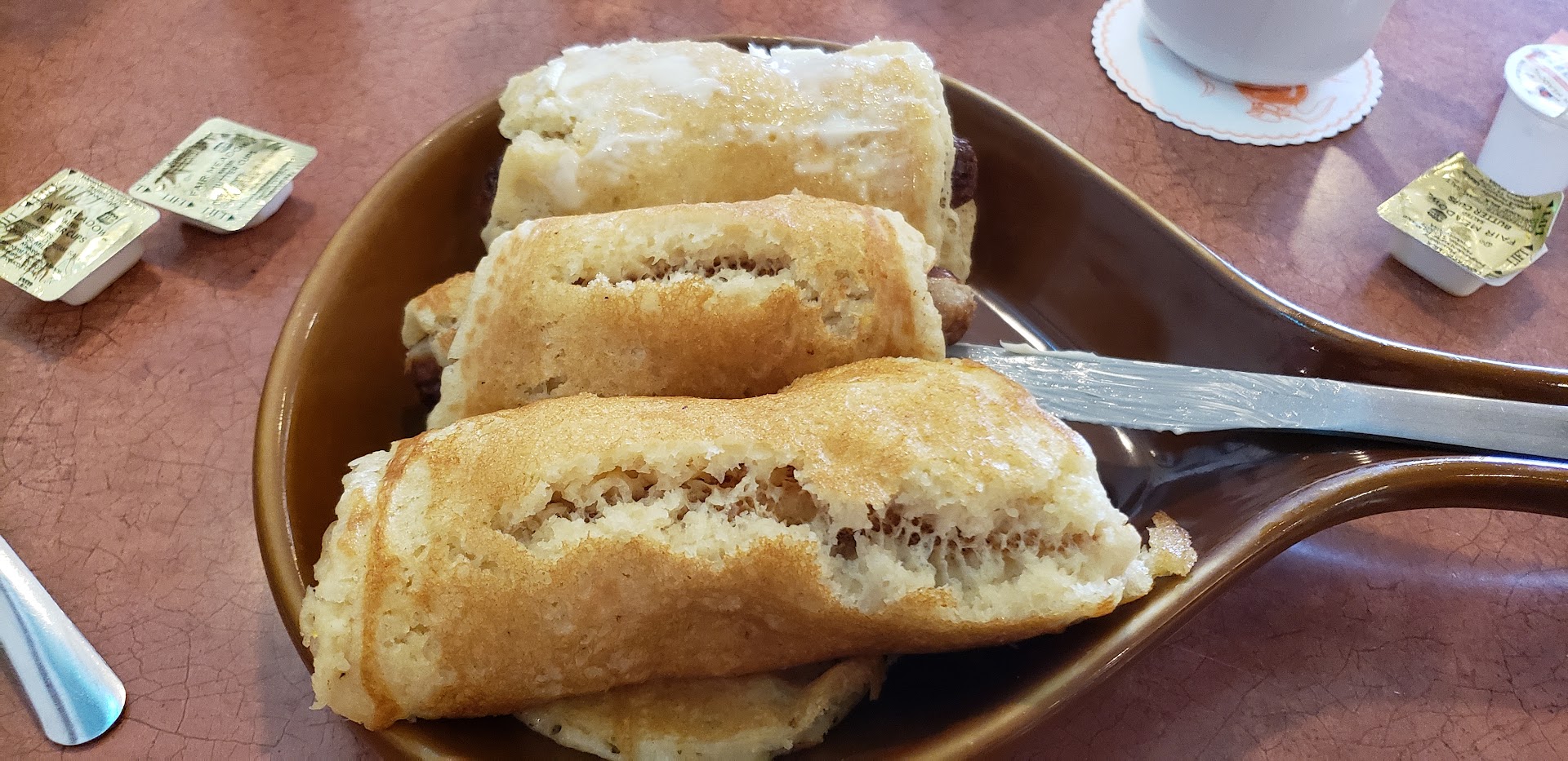 When I read the description of the "cream cakes," they sounded yummy. Miss Inez, our waitress said they were fluffy and light. I chose the pigs in a cake, three extra large pancakes wrapped around nice sized sausages, not like Hormel Little Sizzlers, think more like the size of a hot dog. They smelled like vanilla, oh, my goodness, they smelled good!