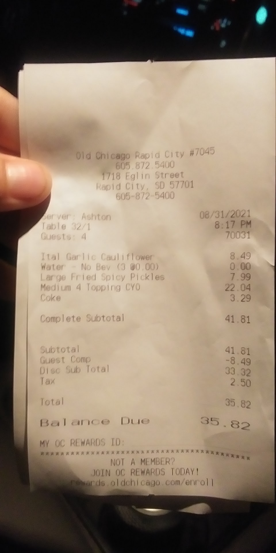 Read moreVisited for a dinner on Saturday, the 18th of December. Got a nice booth in the bar. This would be our 4th visit to the restaurant since they opened. On a previous visit we sat at a booth close to the kitchen door. A very loud group of employees congregated at a booth close to ours that had complaints about everything at the restaurant. Made it difficult to enjoy our meal. This visit we picked a booth on the other side of the bar area. Still a large group congregating at the booth by the kitchen door that was so loud you could hear them over the rest of the people in the bar. Perhaps employees should find a place to talk about work not in the customer seating area. Service was Ok, I don't fault them for that everyone is short handed but when we received our baked spaghetti and meatball dish the spaghetti was in a giant lump all stuck together in the bottom of the dish. It looked unappetizing and I understand everything is supposed to be stuck together with cheese but this was literally a giant lump of compressed slimy noodles. I don't know how they could not notice the problem in the kitchen. I have ate at Old Chicago in many other cities and have always enjoyed the experience. When one opened here in Rapid City I was sure it was going to be our new favorite place to go. It is dropping fast on our favorites list. In this time when businesses and people are struggling financially it really is important to making an experience fun and enjoyable, not just a place to eat and drink a beer. I can do that at home for less money and not drive across town to do it. I sincerely hope they are able to fix...