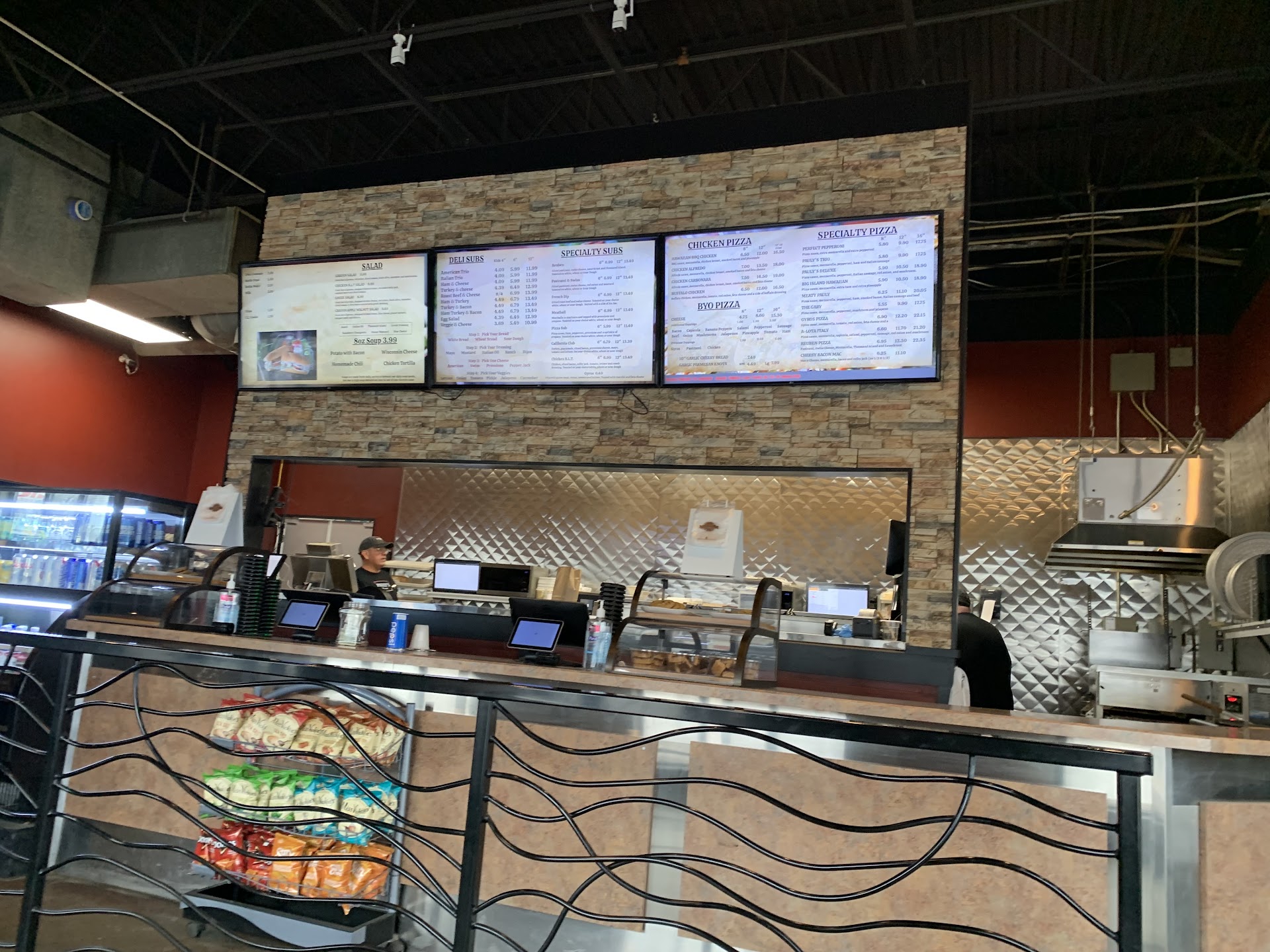 Impressive place. Small but good. The pizza selection is unique. The subs are great. Soup-great. Cheese curds- great. $60 for dinner for 4 was a little high until we realized we ordered enough food for 8 people. When we saw it on the counter ready for us to bring back to the table our eyes were pleasantly surprised. We had a fiesta pizza, a paulys trio pizza and a cheesey bacon mac pizza all 12" and a half sub. Four people. It was good. The to go boxes were much appreciated. The only things that bothered me was the fact that, as new comers, we could have been directed a little better. We stood outside the que while we studied the menu but no matter where we stood we felt in the way. There was not a place to stand and look at the menu and evidently there is not table service so what do ya do? Also the cashier, although she had good eye brows, DID NOT SMILE. A simple smile, welcome "Here is the menu if you have questions please ask" would have earned a hard 5 stars from me. Smile people, it's your job. We all deserve a kind smile especially when we are coming in to spend money with you. So even if you hate your job it is your job until you leave. My job, when I come in to eat with my family or friends, is to be polite, spend money and not make your life more difficult. I say that in respect to any food establishment. Just be nice to people doing what they are supposed to do because if customers don't come in and spend money you don't have a job. It seems simple. I would love to love so many places but the service is scary. Worth noting: I did not try the beer but the selection was vast. I would say 12 or more on tap. You fill your own glass so poor heavy or light however you like. I think that it is worth a second trip if I am back in the area. I recommend Pauly's and I hope the gal was just dealing with a toothache or something and will have better...
