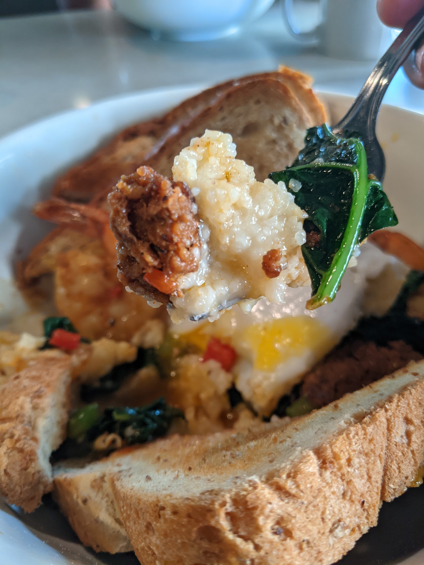 To start, breakfast isn't their strong suit and the fact that they didn't have fresh orange juice was honestly disappointing. The bar was open, but only for beer and wine [which I found to be weird first thing in the morning--would've like more brunch beverage options and feel that would make sense for the vibe they have going]. My good friend and I both had the special of shrimp and white cheddar grits with chorizo and swiss chard which was tasty but a bit lackluster; we did not detect the cheddar in texture or flavor and the grits were a bit undercooked so the mouth feel was not the best.