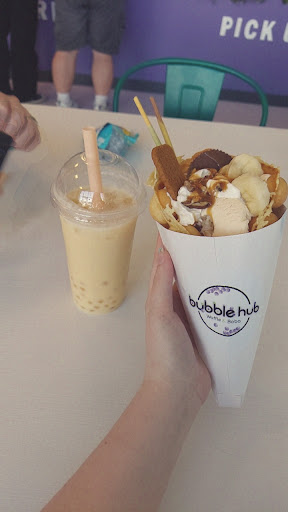 Read moreMost of the other reviews are pretty accurate. If you get two flavors it is a bit on the sweet side, even for boba, but physically they taste pretty good. I got a pineapple milk tea with regular milk and I don't know if it was the milk, flavor, or what, but my drink was constantly trying to separate and it made it really unappetizing (Not pictured). It is also definitely expensive, and the menu is kinda limited. Two drinks and a waffle to share was over 30 dollars...but the waffle was good. Employees also just seemed kinda lost and confused but maybe it's just because traffic picked up a bit. Fun for maybe a treat but I'll stick to...