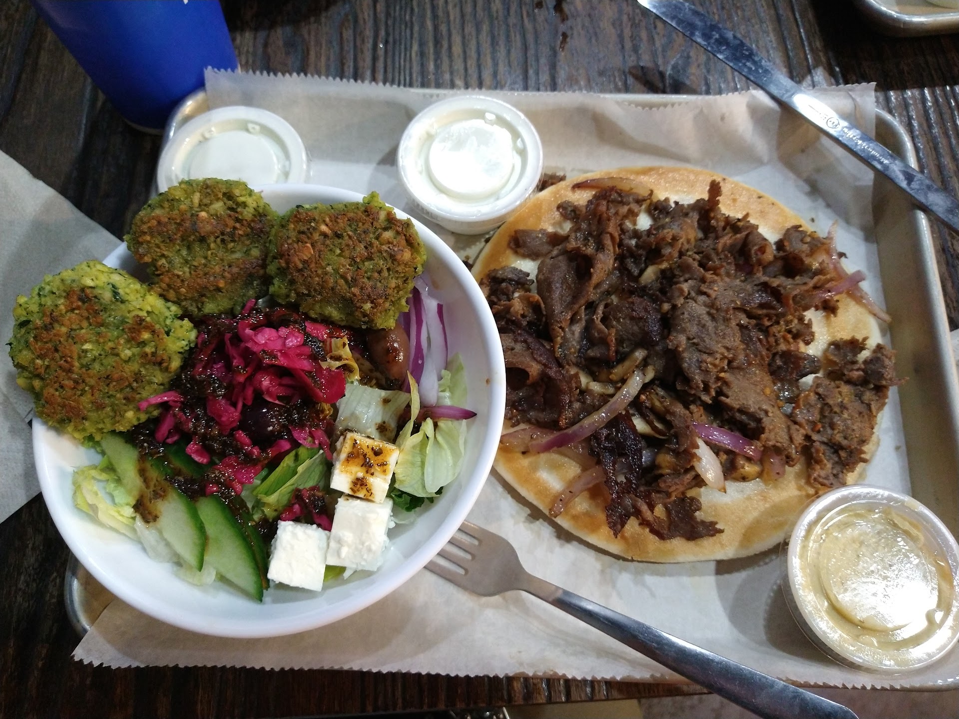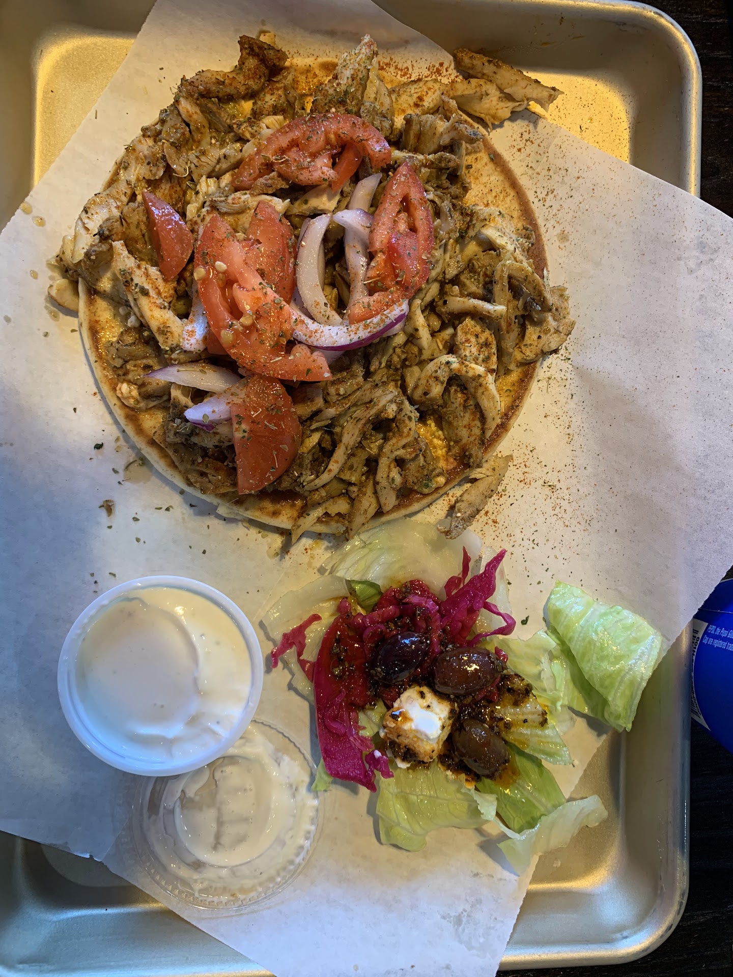 Read moreThis was disappointing. I live in Europe and I certainly didn't get what I was expecting. The "chicken" gyros were really bad. It's not really "gyro-style" chicken at all. Just a clump of diced chicken, thrown on a pita, a few slices of tomato and cucumber on top and then some really nasty-tasting spice mixture liberally sprinkled on top. You couldn't really pick it up and eat it, and the only utensils available were plastic forks (which wouldn't cut through the pita). There was a very small container of "tzatziki" that came with the meal, but it was basically a clump of sour cream that had maybe been near a cucumber once. NOT good tzatziki at all. (Interestingly, one of the side dishes you can order is that same tzatziki: for $1.75! A serious ripoff in my opinion.)