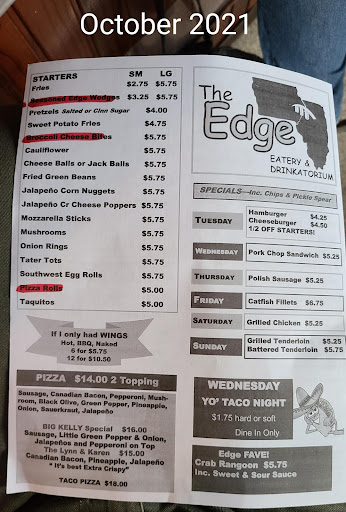 We really like The Edge. The building is nothing fancy but it is clean and well kept. It was voted 'number one dive bar' in 2023. It's a favorite with the locals, trades-people on their breaks, motorcyclists, and people just passing through on the highway or Interstate. There is plenty of inside seating, a huge parking lot, and a large outdoor seating area with a canopy and picnic tables, The staff, owners, and customers are friendly to everyone. It is not a rowdy bar and it is family friendly (there is a kids menu). They have cheap drink prices and very reasonably priced bar food: as of Nov 2024 most sandwiches range from about five to eight dollars, chips add a dollar, fries add about three dollars. A can of pop is a buck. A favorite sandwichs of mine are the hand-pounded and breaded deep-fried tenderloin and the large polish sausage (they have local, Boetje's dark mustard available). There are a few video gaming machines. They have tacos on Wednesday evenings. They occasionally will have a small band...