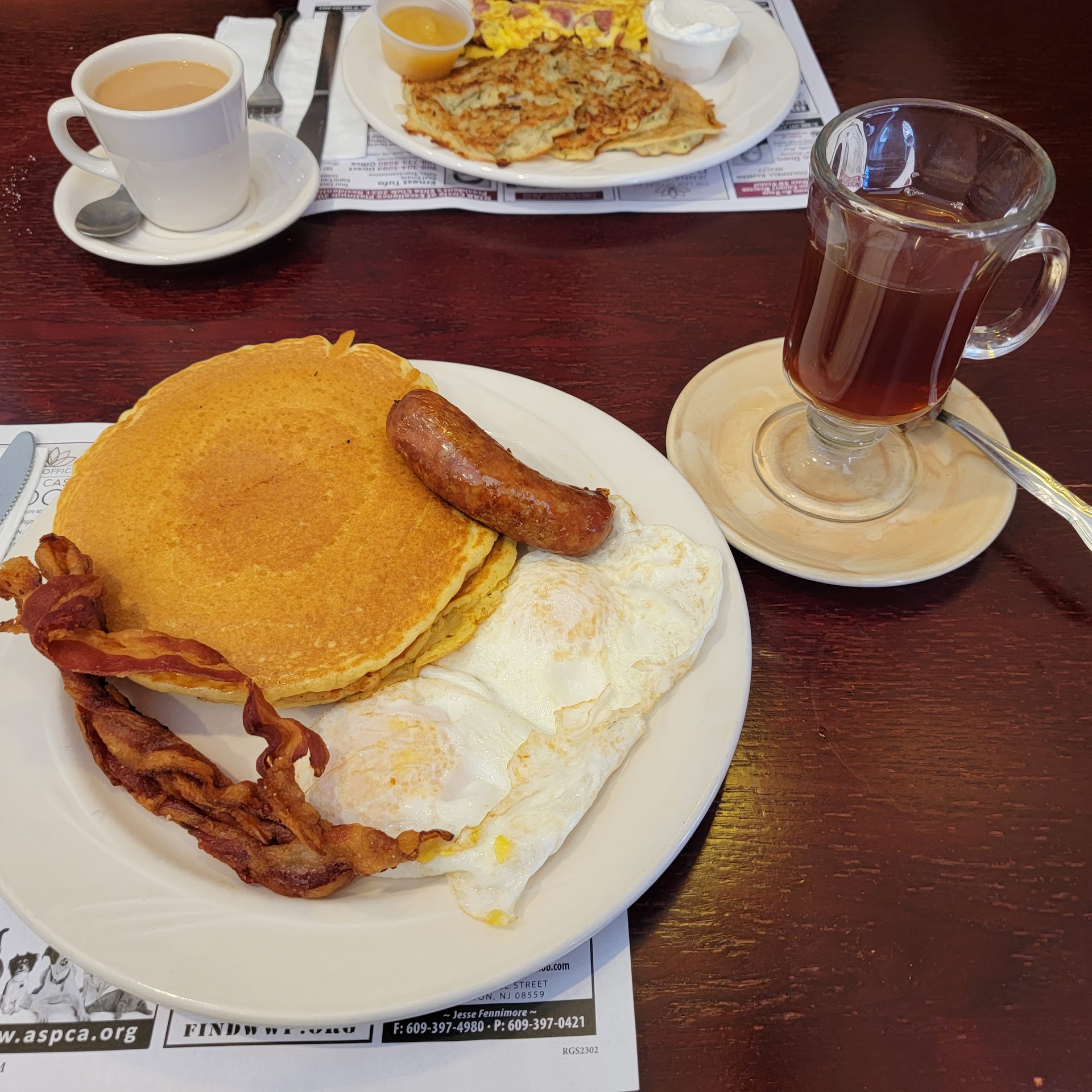 Read moreI ordered the Big Breakfast which came with 2 pancakes, 3 strips of bacon, 1 sausage, and 2 eggs. The pancakes were fluffy and eggy with a soft chewy texture, sausage nicely browned, not too salty, but could have had more flavor. Pancake syrup is the standard sweet stuff, high fructose corn syrup based and not maple syrup, but was at least served in a clean (not sticky!) squeeze bottle. The bacon was nice and crunchy, not too dark, salty, or greasy. I ordered the eggs over medium, and they were cooked fresh to order and not rubbery or over fried. Service was prompt and the server friendly and attentive. The price is reasonable for the amount of food you get, which is a sizeable portion. The interior is updated, clean, and contemporary. The furnishings and fixtures look and feel fairly new. Interestingly, you can pay your check on your phone using a QR code on the receipt, so there's no waiting in line to check out when you're ready to go, but you go pay at the...