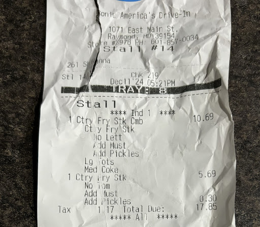 The Raymond MS Sonic very rarely prepares our order correctly. You can see how neither order is correct. No lettuce on one, no tomato on the other. This happens often.