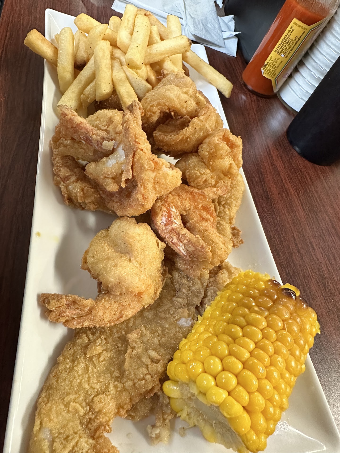 Fish and shrimp platter was good. Everything was seasoned well. Fries were seasoned as well. All of the items in the plate were hot. Breading and seasoning seems to have changed from last visit.