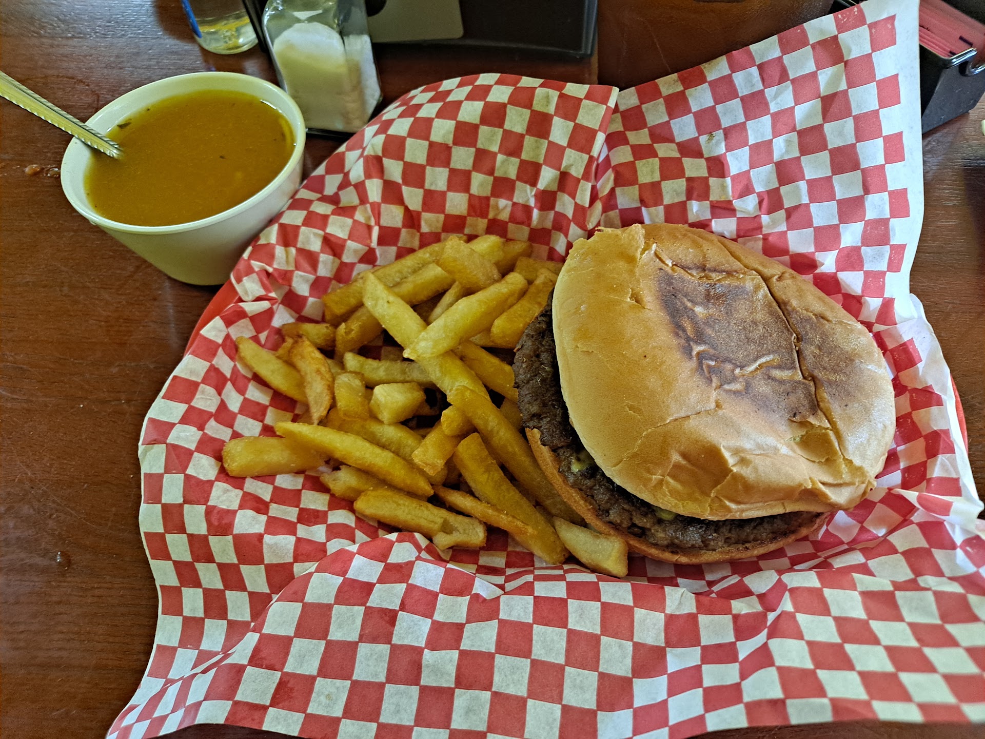 Hamburger with bacon and cheese with toasted buns had a rich meat flavor, served with all vegetables on the side and thick fries. So delicious!