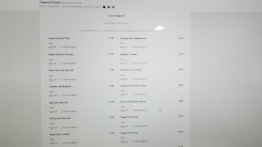 Taste of China is a Chinese restaurant that specializes in carry-out food. It's located in the Price Chopper shopping center along highway 58. I have been there twice and found the food to be reliably average.