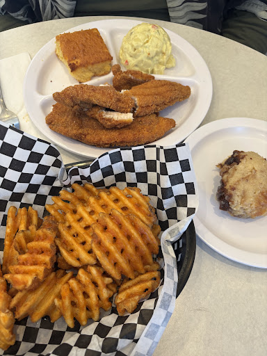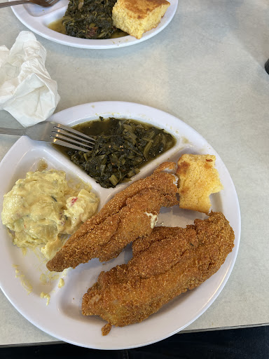 We stopped here for lunch to try something different on our trip and have regrets. The lady behind the counter took a while to acknowledge our presence but then told us the lunch special. Wife and I both decided for the lunch special; wife asked for no greens as the only change. We were given cups but one of the fountain drinks were out. The wife went to the counter to tell lady the drink was out to be told it was empty and they were going to change it "in a while." Wife asked if they could fill her cup from the fountain dispenser by the drive thru window. This was met by a sullen stare and then she took the cup and filled it. Our plates arrived... and my wife's plate had greens but no potato salad. She went up to the counter to have this remedied to be told by the same lady; "Oh, I must have forgot." rather flippantly. We sat down to eat and enjoy our food, and it was okay. The fish was hot, the potato salad was nice, the greens I enjoyed. When the lady sitting at the table next to us asked us to look at her chicken strip. She had just spit out a bite surreptitiously and held out the strip. It was raw. Not just under cooked but raw. She showed the lady behind the counter and left. At this point we lost our appetite and left. We did get a to-go plate for the leftovers to give to the dogs. And on a final note the folks working in the place were rather foul-mouthed. Obscenities was bandied about. "That woman just left. What do they expect?" etc, etc. What could have been a good dining experience went sideways fast. Mostly due to the subpar service we received and saw others receive. The lady with the tattoos was not customer orientated nor seemed to care. That attitude certainly soured the meal. It was the worst meal we encountered on a six...