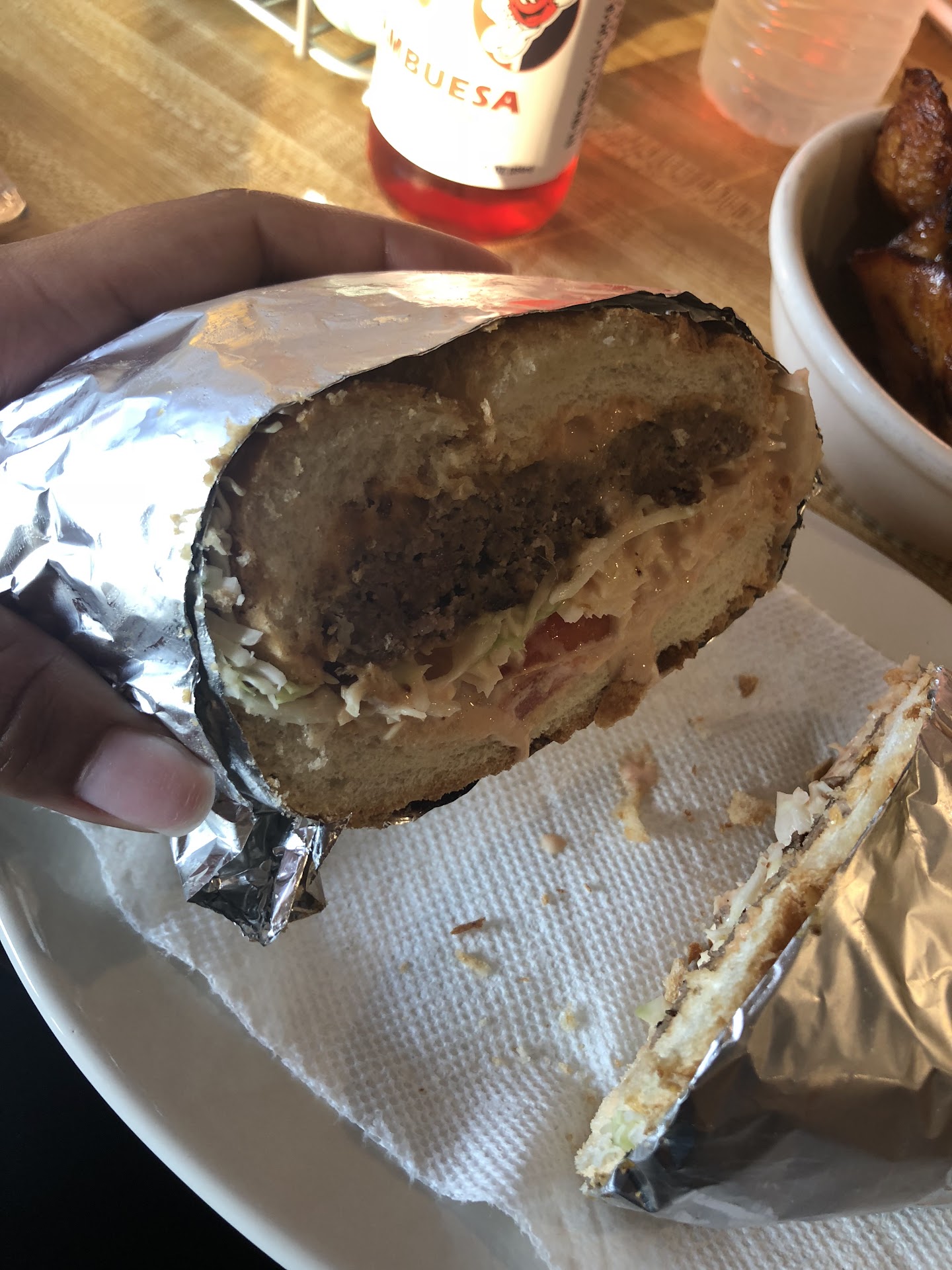 Once it came I was skeptical but ate it. It was good, the bread was a little to crunchy but I still enjoyed it. I enjoyed the maduros and the pernil. I would go back just to try...