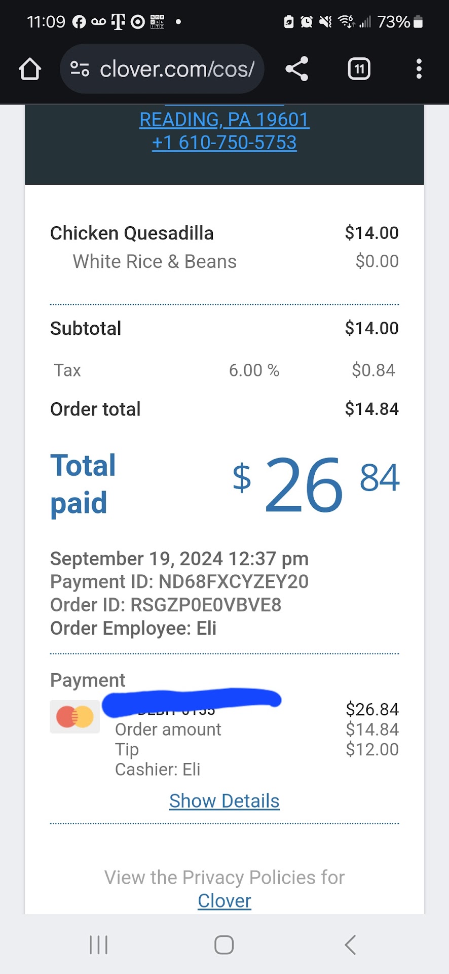 Β Β Β Read moreOrder for myself and staff members. All tacos & quesadillas were missing everything(lettuce, tomatoes, guac) aside from the extremely small amount of meat & cheese in each one. They told us that we ordered them all plain, however it states to mark what you do not want(which was only marked no lettuce for one taco, the rest wanting all toppings), and no option to add the toppings. A side of rice & beans, and french fries were missing from the order. When called the person that answered the phone was very unpleasant and disrespectful and told me that he didn't know how the whole ordering online thing worked so he couldn't help fix...