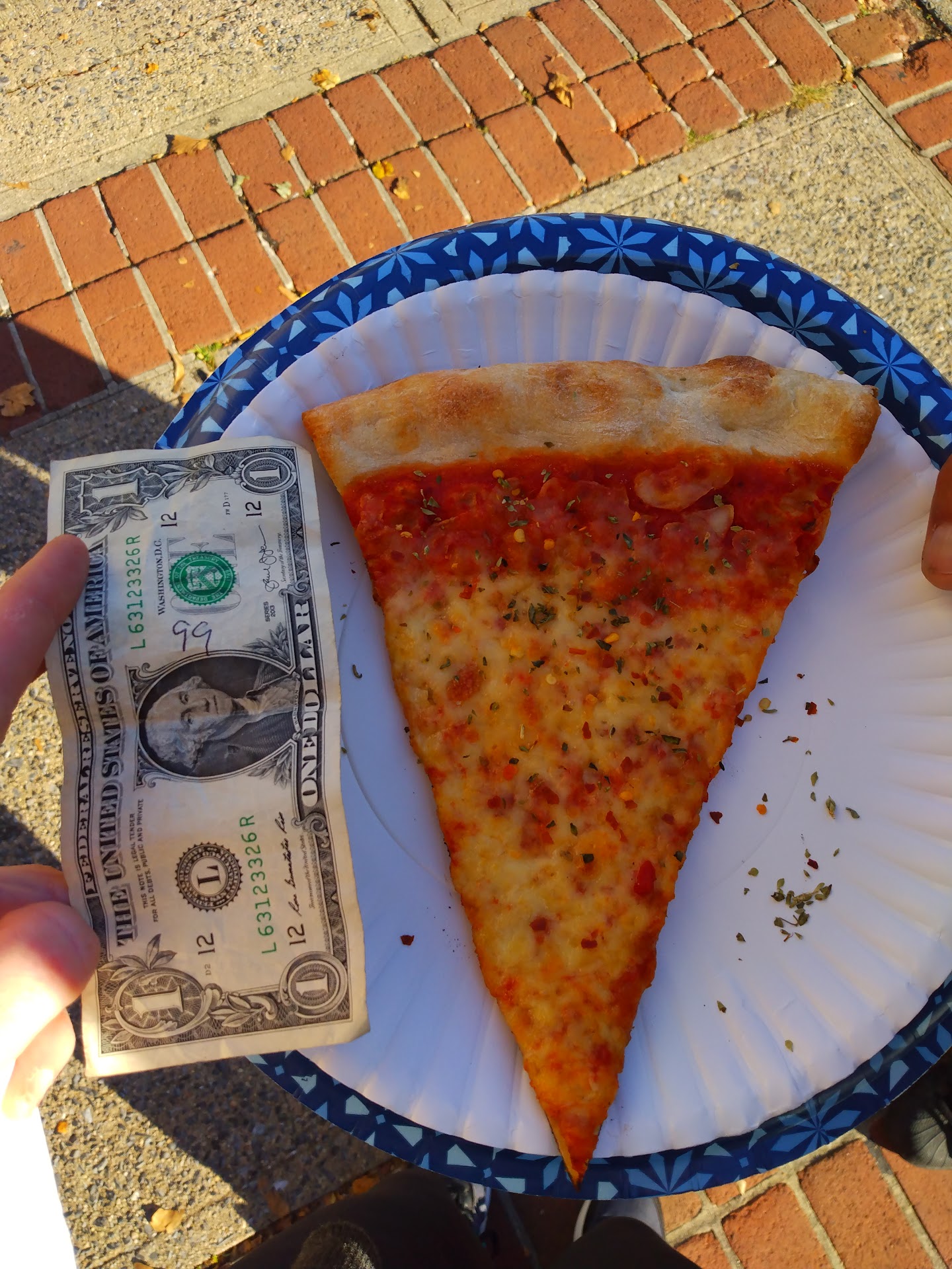 Read moreIt's clean inside, all of the workers are super nice and polite...pizza is usually always very good...But, on this last visit there, my fiance ordered a slice of meat lovers (which he did highly enjoy) and I had ordered just a slice of plain....the total came up to right below $9 (that's without any drinks) so my only complaint is that my slice of plain that I had ordered was so extremely small, it basically was a slice of pizza cut into 2 slices, so honestly, even tho we both agreed that the pizza was good, for the amount that we had paid, I was very disappointed!! My half of a slice definitely should not have cost the amount that it did for the size they have served to me.(In the photo, I placed a $1 bill next to it to show the actual size comparison.) But I do enjoy Russo's pizza, so I know that I will def go bk there!! so hopefully the next time I return this situation will not happen again so I can give it the rating it...