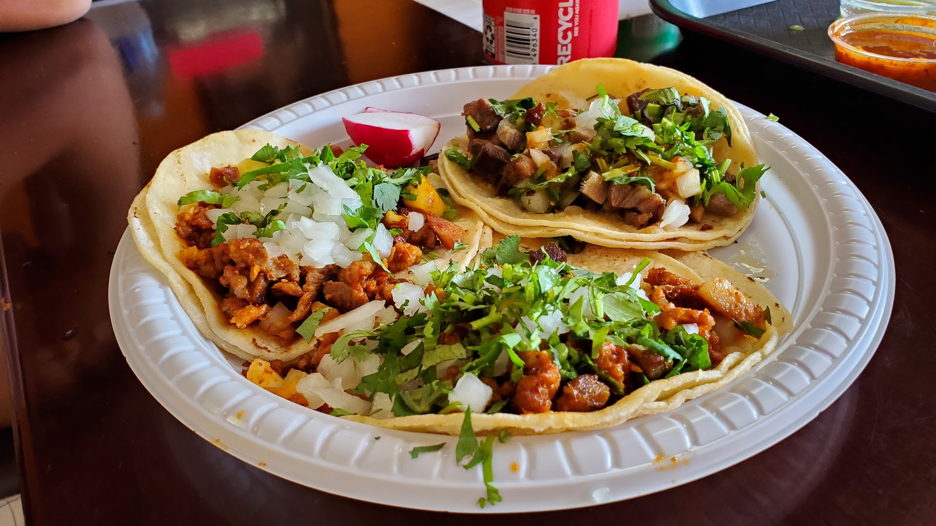 Their tacos and pupusas are among the worst I've had, they were TASTELESS, they're don't even come close to imitation of either one I know, I get around and we have them both within reach, I thought they will be good, my mistake, I urge you, go anywhere else if you can, although they are busy at times, I will not ever step in or order from this place, the treatment I was given was like when we see a nasty insect, I wasn't even thanked for my business or greeted at all, made me feel my business and person weren't welcomed there.