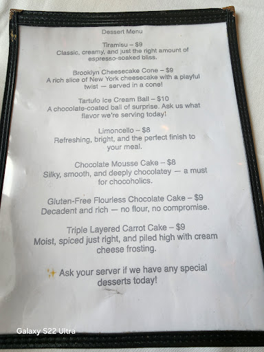 We arrived and were welcomed after a few moments and pointed towards our table which had a broom and dustpan still blocking one of the seats. No worries as they had just opened. The employees were all very nice and the chef even welcomed us and checked in throughout. The food was in fact very good, with very healthy portions. We both left like overstuffed pigs. They rifled through the courses with no real break in between and the check was on the table before we even finished eating our dessert. Quaint, little place and homey. Bathroom was a bit odd, hot as hell and the mirror was a small womenās vanity mirror on a table, but all in all nice place. They were about to have music play, which the set up seemed a bit disjointed, but it was kind of like being at an Italian aunts home. Overall we enjoyed the meal, service and atmosphere. Still have a bad taste from getting such an attitude over a post garnering reviews from locals and trying to support a local business. Very unprofessional as it was accusatory of putting them against one another rather than just gaining insight from people that may have experience...
