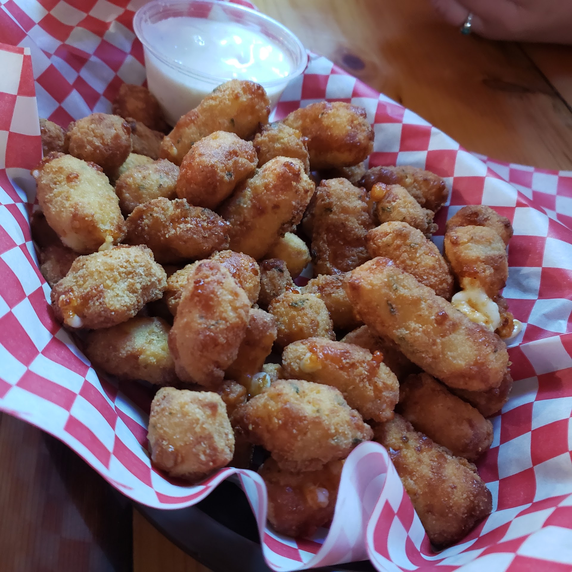 First time here and it was delicious! Bartender was attentive, gave great info and was overall awesome! She deserves all the tips being the only one on the floor handling 20+ people. Food was mouth watering, hot and left us wanting more. Had the chicken sandwich w/everything ( huge fresh breaded chicken breast) , pizza w/ pepp and sausage ( super tasty & crispy without being burnt or hard) , fries were thick and wonderfully seasoned. And the garlic cheese curds are to die for. Get a double order for the table with ranch , you wont regret it. Paired with on tap Spotted cow we were stuffed. Will definitely be back when we are...