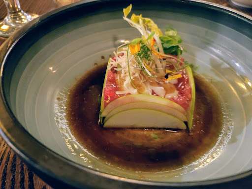 I sampled a few things. The tuna tartare was the star of the night. Those are actually paper thin apple slices you see. Iām not sure how they got these to stand upright so perfectly. I wanted to order a second one but didnt. The pork gyoza and chicken satay were decent. The chicken was white meat and a little dry but the sweet peanut sauce took care of that and had some nice curry flavorā¦not spicy.