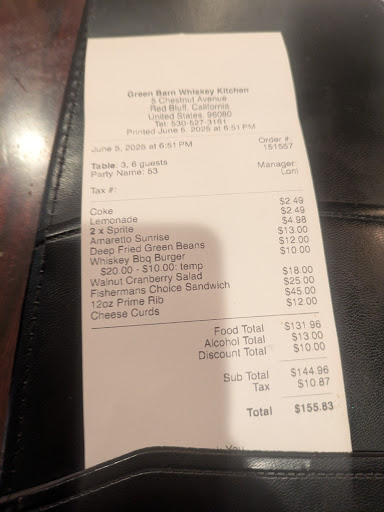 Read moreWell while visiting my brother, sister-in-law and nephew in Red Bluff, for my nephew's graduation. We were looking for a nice place to eat dinner with the whole family. My brother pointed it out to us on our return from a wonderful day trip to Lassen and said it had great marks with all his friends. So my uncle and I agreed that we would try it out, which we did last night. My uncle had an excellent New York strip which was Priced Right and a good healthy portion. My nephew had the New York sandwich, which was amazing looking. The two ladies in our party had the Philly cheesesteak, which they loved! I had my all-time favorite..... baby back ribs, when the ribs came out they looked incredible, they were huge, like the ribs that you used to see on Fred Flintstone's car!!! They were so big and meaty, I was only able to eat three, but that just means I'll have another 3 days worth of ribs at home for lunch. They were cooked to Perfection and I have no complaints, only High marks for their food. I saw a many private parties and everyone seemed to be really enjoying themselves and having a happy night, this included us. We will never forget our time at the Green Barrell Whiskey Town but... for the life of me I cannot remember our waitress's name, but I know that she was originally from upstate New York, which we had a lot in common, because I've explored that area quite extensively, it is beautiful beautiful country and she was an excellent server, waitress and guide. She told us of many wonderful things to see on the coast, knowledge we were thankful for, much thanks and accolades for this young lady! I don't believe it would be disappointed if you go and enjoy yourselves in this fine...