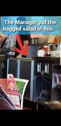 There were 5 of us who decided to have Christmas dinner at Denny’s. We chose Denny’s because one of my sisters had been in the hospital ICU for 12 days and wanted to eat somewhere close. When we pulled up, the handicapped parking space was taken by a big box truck with no sticker and no place card. My sister has a handicapped place card and wasn’t able to walk very far so the first thing I did when we walked in was ask for the manager to see if he would find out who parked their box truck in the handicapped spot because my sister needed it. The manager came to the front and pretty much said there was nothing he could do. He didn’t care in the slightest. I decided to let that go and we were sat at a table where we waited for over 30 minutes for our drink orders to be taken (mind you, it was not that busy when we were there at 3pm). We finally got our drinks but while sitting there waiting for someone to take our order (45 minutes after we had gotten there), all of the sudden my son’s fiancée’s jaw fell open and she let out a gasp! We all looked over at her and she said that she witnessed the manager (THE MANAGER) open a bagged salad with his teeth and proceed to dump it in some container. ARE YOU KIDDING ME???? We were FURIOUS! I mean, not only is that a health code violation and not only is it absolutely disgusting but we are in the middle of the COVID Pandemic and the MANAGER is opening bagged salad with his teeth!!!!! This was all we needed to see. I saw several other men walking around the kitchen who looked like they were some type of manager so I motioned one of them over to our table and asked him for the number to the corporate office. He asked me why I needed it and what was wrong. I told him that I did not want to discuss it with him but wanted the number for corporate and wanted his store number. He told me that he was the Regional Manager so corporate would just end up calling him to handle any issues and he would not give me the number unless I told him why I wanted it, so, I told him what was witnessed. He said he was sorry that happened and he said he would take care of it and walked away. I was not happy with his nonchalant attitude and told him that I would find the number to corporate myself and of course we immediately left and went somewhere else to eat for our own safety. It took all that I had not to stand up in the middle of the restaurant and tell everyone what we just saw. This is a health risk to the public!!!! To have people, especially the MANAGER, opening bagged salad with their freaking teeth!!!