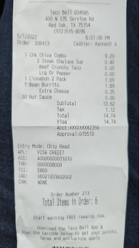 Read moreTerrible first impression. I have been living in Red Oak for two years now and I didn’t know we had a Taco Bell. I decided to give it a chance today. I have been on a strict vegetarian diet to lose weight the last couple of weeks. And I thought to myself, I deserve a cheesy treat today.