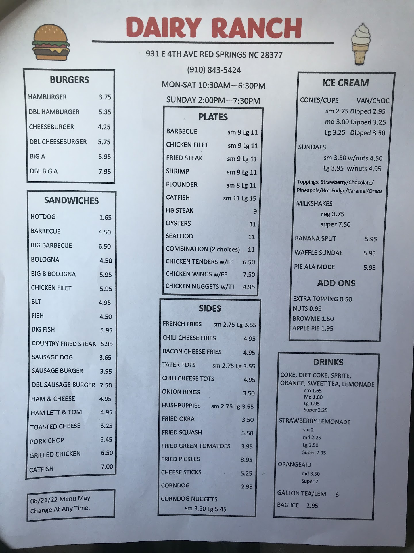 Read moreI have lived in and around Red Springs all my life. I have loved the Dairy Ranch since the first time I got ice cream from there. The customer service is excellent and they care about the people of the community. I have an ice fix that has to be feed and really only this place can fill. I am always recommending this little gem to anyone new...