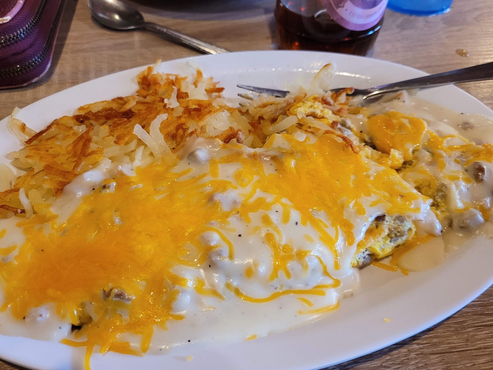 Read moreHate to do this but…had a horrible experience here. We were seated within 10 minutes and then waited an hour for our food to arrive. We saw other tables getting their food before us when they had arrived after. I had the breakfast burrito which was fine. My home fries didn’t have any seasoning or look fried. The over easy eggs came well done and when they were replaced as requested, they had egg shells in them and were underdone. The pancakes were perfect. The women’s bathroom was awful. It was so dark you could barely see yourself in the mirror and the walls were covered in old adhesive from past soap dispensers and such. The overall lighting in the cafe was bad. Dim track lighting and decor made the atmosphere unattractive. To add insult to injury the electronic tipping options BEGAN at 22%. Whenever a business does that it is just shady. You’re trying to take advantage of people by putting them on the spot. Our server was the only bright spot in this place and I gave her a custom tip of 20%. We were in town for a girls wknd and every other establishment we visited was wonderful. This was a bad...