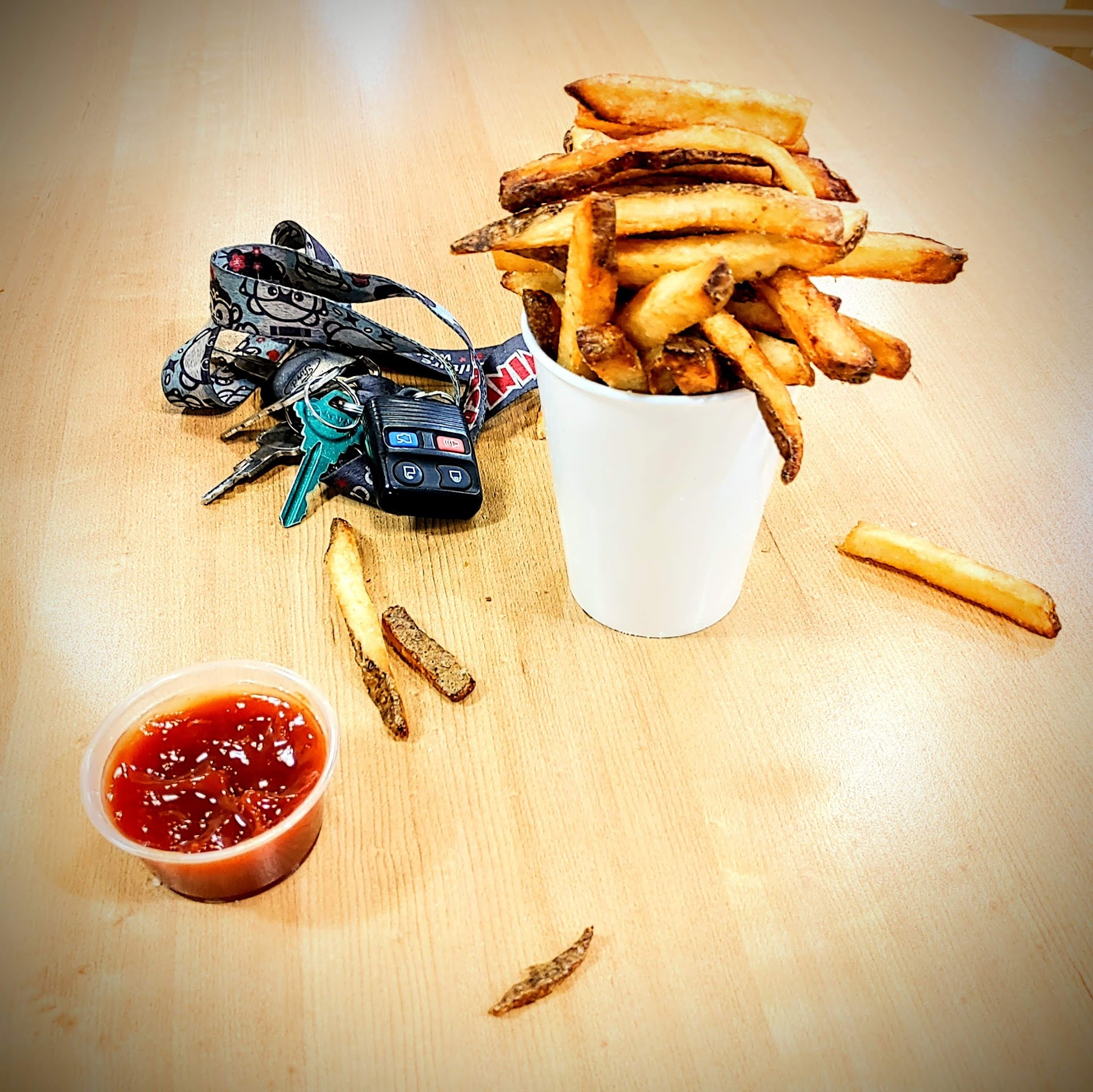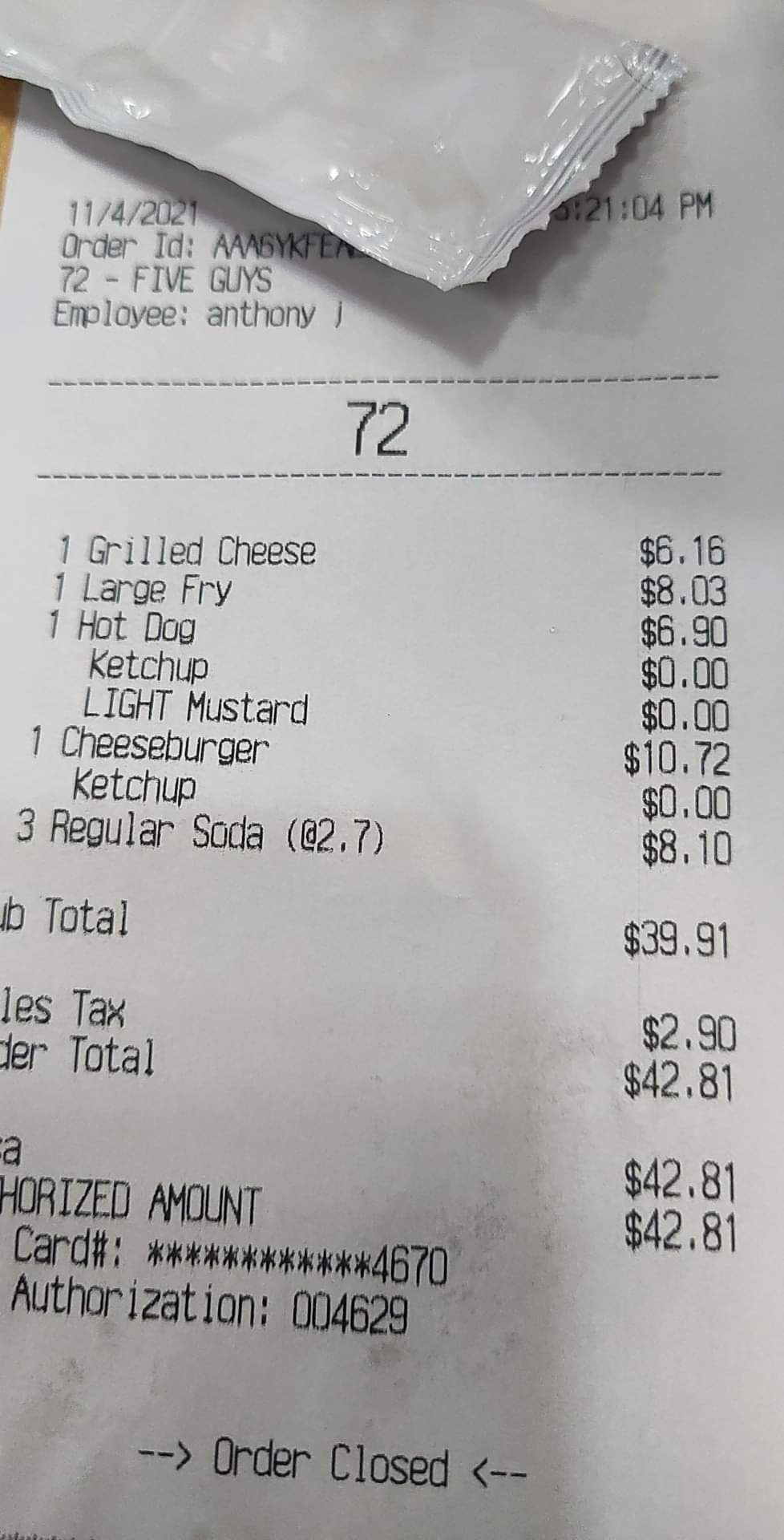 Read moreI just left five guys and all I ordered was French frys a drink and a burger it took them so long to make my order I was the only person in there when I finally got my order I opened my bag and the frys were just dumped in the bag nothing to hold them except for a small cup that looked like a scooper I opened my burger and it was a total mess everything was falling out of it the whole entire bun ripped in half I barely even ate it wasn’t even that good when I first walked in though was a worker off the clock standing by the register just talking to other employees and no one helped us for a bit they argued about who should help us once someone helped us i stood around after my order was taken I watched someone throw a bun on the ground and sit on the ground it seemed to me everyone was just...
