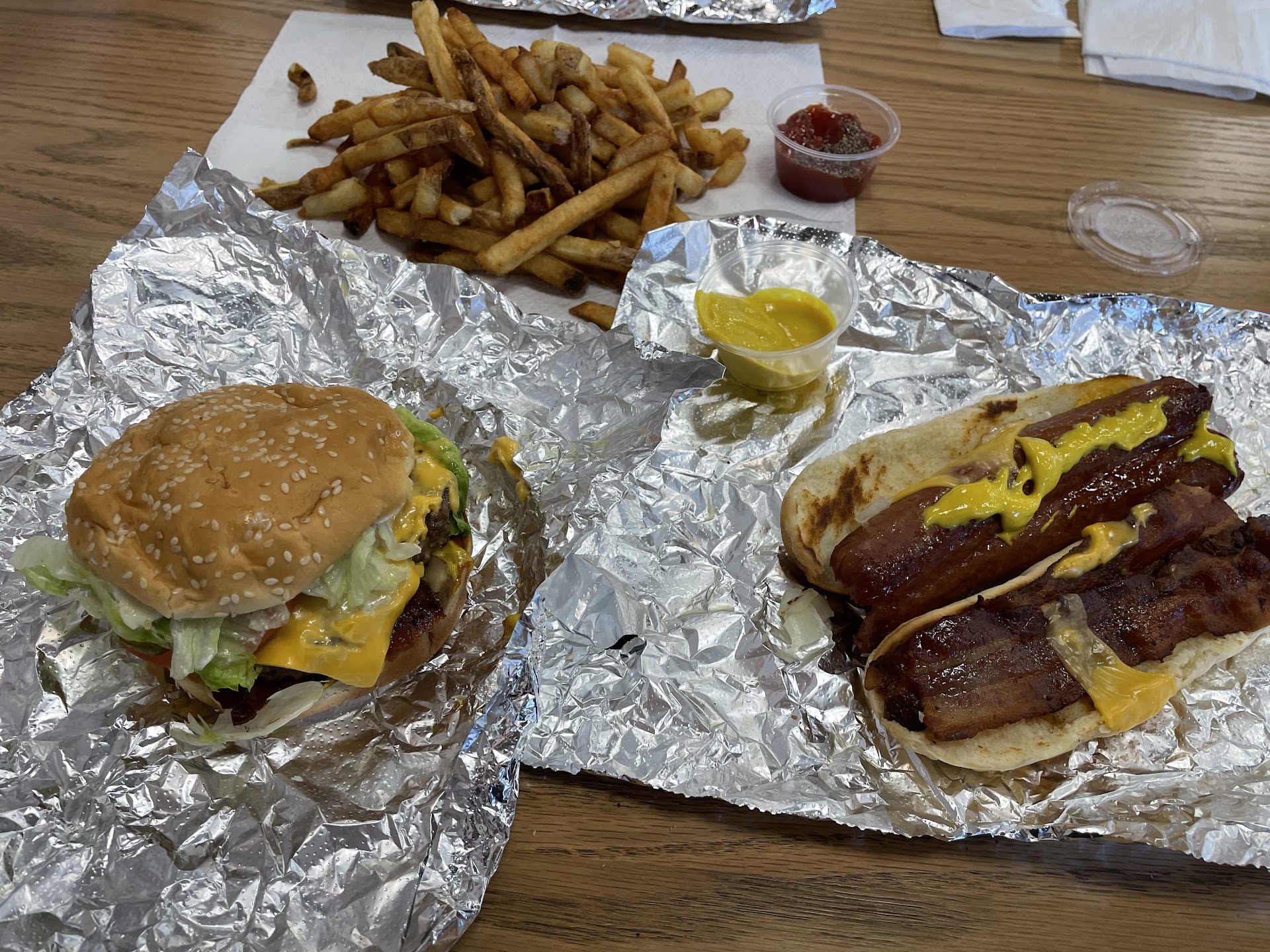 Alright, this one was surprising. I’ve always heard that five guys is a great place, more than great, if anything—perfection. I hadn’t been here since I was a kid so I forgot everything, and after about 20 seconds of me looking at the menu (no line behind me) the cook yells “are you getting just shakes? Or what? A hotdog? What are you getting?” Then, the cashier looks at me and says “are you ordering burgers?” 1 or 2 patty’s?” Like I don’t know I’ve just barely got here, hold on two seconds💀. I was very rushed for no reason. But whatever, that’s not mainly why I rated 2 stars. Mostly it’s because of the price you pay for a burger (I got a bacon cheeseburger) which is about $12, compared to the quality of the food. I’d say the burger tasted the same as a simple sonic cheese burger, and the bacon was so over cooked (In my opinion) that it tasted like crunchy store bought salad bacon bites. The patty itself was good though, and not greasy. The burger isn’t bad, but it’s definitely not worth $12. The most id ever pay for that same burger again is $6, maybe. I also got a peanut butter shake and seasoned fries. The fries were great, although a little over seasoned (some fries were literally powdered in the seasoning and I’d inhale it like powdered sugar and choke hahah). The shake was delicious, very tasty. In the end, I don’t think I’ll be coming back, it’s highly over rated and far too expensive. The fries and shake are good, but not the burgers, which is what they’re...