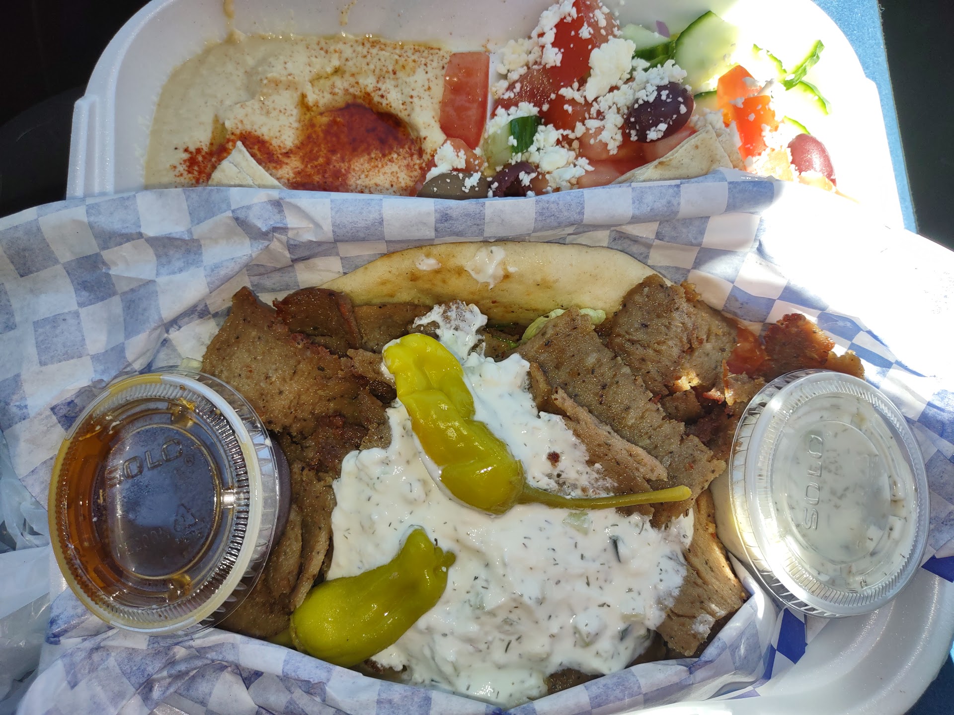Read moreI was craving Greek food and this really hit the spot. I got the lamb gyro plate. It comes with a huge gyro, hummus and pita bread, and salad ($20). All delicious. The lamb gyro meat was soooooo good. I also got a piece of spinach pie with dipping sauce for $4. I thought $20 was a bit pricey but the portion was big enough to split between two people. The location is a small blue hut with two covered outdoor tables. No indoor seating. The food was prepared quickly. I will definitely be...