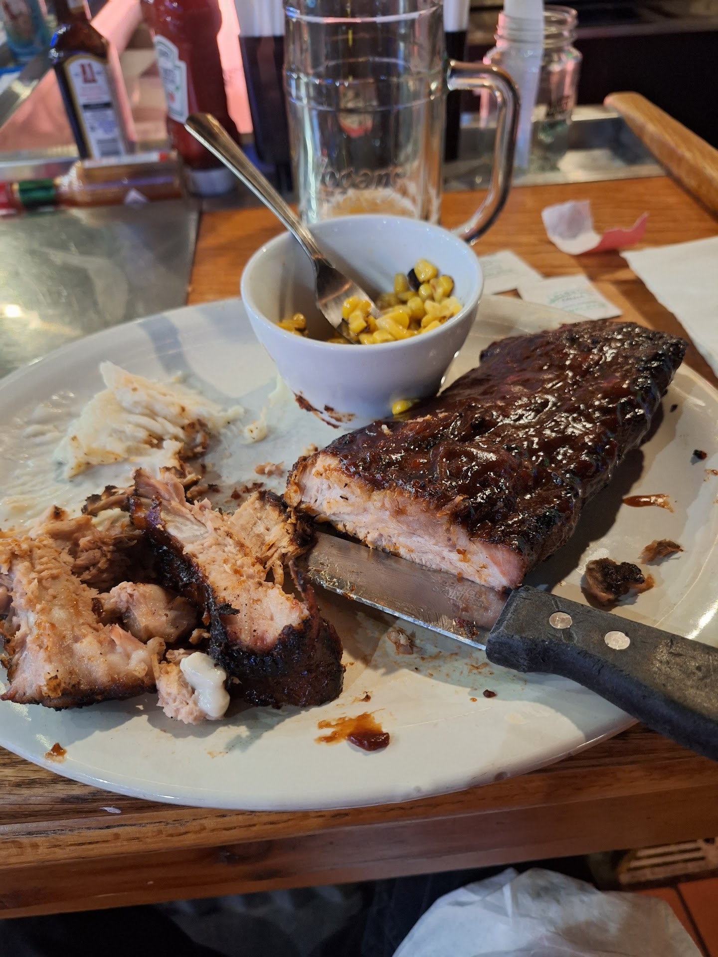 Read moreBefore I share why this is such a low rating, I'd like to mention that the bartender, Durah I think that's her name, was fantastic on her first day behind the bar. She was very attentive and super sympathetic to my situation. My experience started off great and I told bartenders there was no hurry or rush with me. I had a lot of work to do on my phone but I did eventually order once the place slowed down and dinner rush was over. Sometime went by and the bartender kept asking if I was OK, I finally questioned about the whereabouts of my ribs I had ordered. She went to check and they came out a few min later. Upon receiving my meal, it looked amazing, but I tasted the potatoes and not hot, but not cold and the same with the corn. I went to dive into the ribs and instead of falling off the bone I had to use my knife to literally saw the meat off. The bartender ask how it was and since I never complain I told her well it doesn't fall off the bone but I'm OK. However, after sawing to find the second rib and all the work it took, I gave up. The meat had a good flavor, but it was very dry and chewy. I did finish the potatoes and bout half the corn.